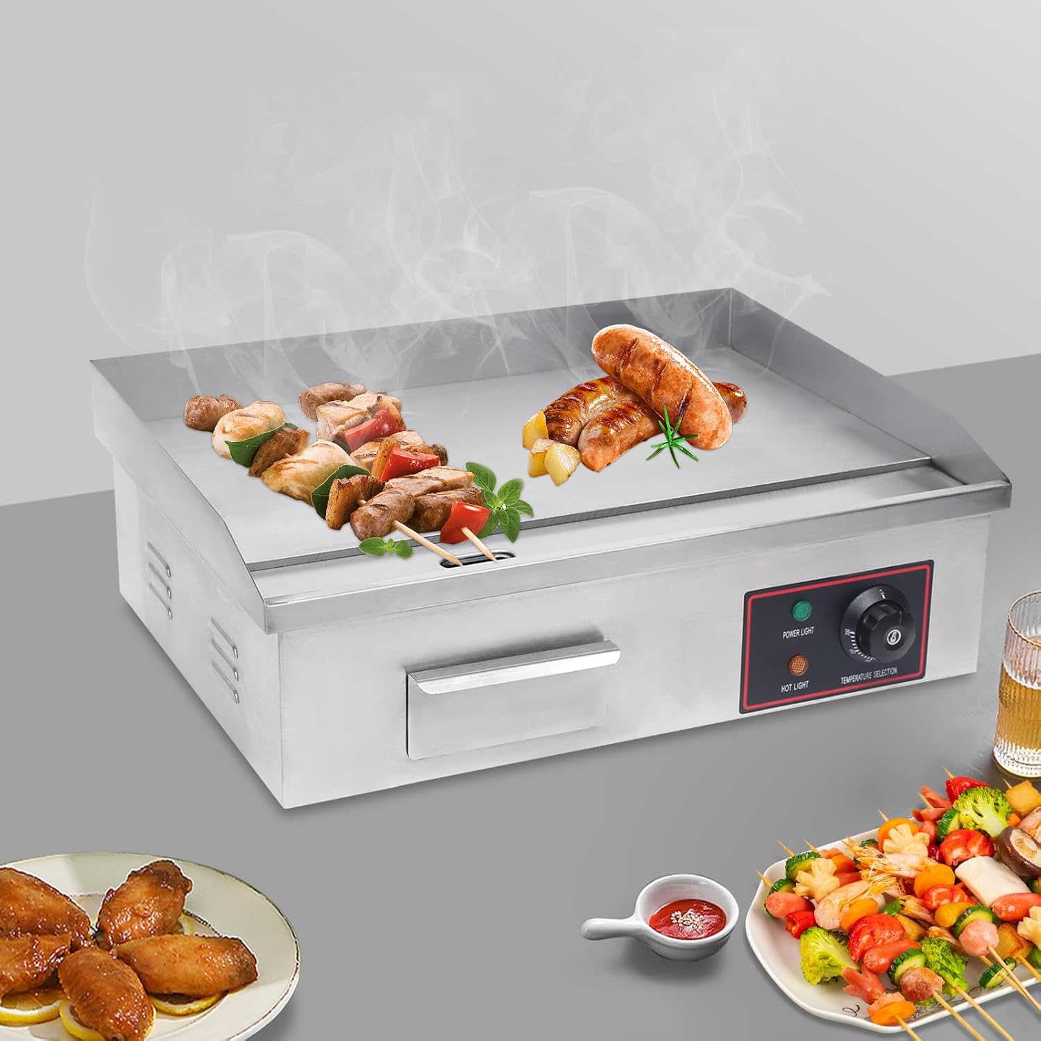 Our electric griddle adopts an efficient and uniform heating method, which enables the ingredients to quickly lock in juice and nutrients, while bringing a special burnt flavor. It is easy to operate, clean and maintain, and is very suitable for commercial kitchens and family gatherings, bringing great convenience and creativity to food enthusiasts.SpecificationMaterial: Stainless Steel, RubberColor: SilverStyle: ModernInstallation Type: TabletopPlug Type: US StandardRated Voltage: 110VFrequency: 50-60HzRated Power: 1.6KWTemperature Range: 50-300℃/122-572℉Power Cord Length: 1.5m/4.92ftProduct Size: 54*40*21cm/21.26*15.75*8.27inPackage Size: 60*48*30cm/23.62*18.9*11.81inGross Weight: 19kg/41.89 lbsNet Weight: 18.05kg/39.79 lbsPackage Included1* Electric Griddle1* Power Cable1* English ManualNotes1.Please check the size carefully before ordering.2.Please read the operating manual completely before use. And pay particular attention to the safety instructions included.