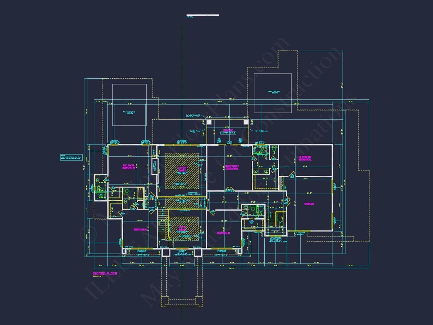 Width: 110′-4″Depth: 82′-6″Htd SF: 6,978Unhtd SF: 2,134Luxury 2-Story House Plan with Custom Modern ArchitectureExplore this striking luxury house plan with 6,978 heated sq. ft., 5 bedrooms, 5+ baths, and stunning CAD blueprints ready for your dream build.This luxury house plan offers a perfect mix of elegance and thoughtful functionality. Designed for spacious living and modern lifestyles, it delivers bold curb appeal and a feature-rich layout.Key Features of the Home PlanLiving Areas - Heated & UnheatedHeated area: 6,978 sq. ft. over two grand stories.Unheated extras: expansive porches, a 3-car garage with porte cochere, and workshop space.Bedrooms & Bathrooms5 spacious bedrooms, including a luxurious first-floor Owner Suite with a private walk-in closet.5+ bathrooms, including a Jack and Jill upstairs—conveniently placed for guests and family alike.Interior Highlights10'+ ceilings and coffered designs that add grandeur and dimension.Open floor plan that unites the kitchen, dining, and great room. Explore open concept layouts.Dedicated Wine Room for entertaining and collecting.Bonus & Recreational Rooms perfect for leisure, fitness, or gaming.Private Office/Study ideal for work-from-home flexibility. See office-ready plans.Generous Laundry Room strategically placed for everyday efficiency.Garage & Storage DetailsGarage Bays: 3-car setup including a porte cochere.Garage Type: Side-entry garage with workshop extension.Storage: Includes mudroom, foyer storage, attic options, and built-ins throughout.Outdoor Living FeaturesCovered front porch and a covered rear porch with ample seating areas.Balcony space for views, morning coffee, or evening retreats. See more balcony house plans.Beautiful exterior materials including a refined mix of brick, stone, and stucco.Architectural Style: Modern LuxuryThis design combines modern detailing with timeless architectural