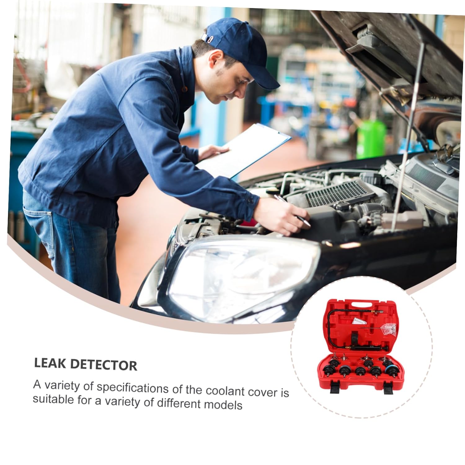 Package List 8 heads 1 x thermometer 1 tank tester 4 connectors Characteristics -Size: 44.00X31.00X8.50cm/17.29X12.18X3.34in Water Tank Leak Detection Gauge -Material: rubber, nylon, metal, aluminum alloy Automobile Cooling System Tester -Color: As Shown Radiator Pressure Tester - If the pointer of the pressure gaugeremains unchanged for several minutes, it means that can be usednormally Water tank Refill Tool. - This product is universal, suitable fortesting most of the models on the market Car Supplies. - If the pointer drops, it indicates thatthe system has cracks due to pressure damage. Check whether there is waterleakage in each pipeline of the water tank, and according to thelocation of the water leakage Auto Water Tank Tester. - After the test is completed, release thepressure from the pressure relief to the pressure gauge to zero Vehicle Water Tank Tester. - Can be given as a present to yourautomotive enthusiast family and friend Car Pressurization Leak Detector.Goods InformationWater Tank Leak Detection is one of the for you.Water Tank Detector Are you looking for a professional, yetaffordable automotive cooling system leak detector set? Are you in search of asturdy, trustworthy tool that can do multiple jobs at once? If yes, look nofurther! Our professional automotive cooling system leak detector set must meetyour needs