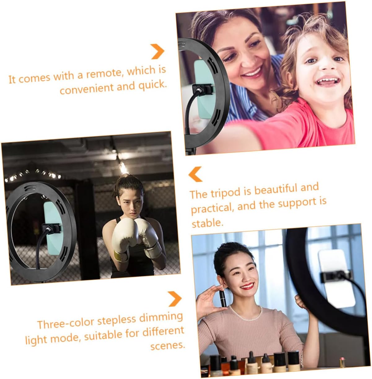 Package List 1 x fill light 1 x tripod head 1 x iron stand 1 x shutter Features -Color: Black Phone Live Bracket. -Voltage: 5V Fill Light Phone Holder. -Size: About 39.00X25.50X18.00cm/ 15.33X10.02X7.07in Phone Light Rack. -Light Source Power: 8-10W Phone Filling Light Stand. -Color Temperature: 3000-6500K Phone Rack. -Light Source Type: 2835 LED Selfie Light Stand. -Material: Plastic, Iron Light Phone Stand. - Made of materials, safe and Phone Light Stand. - Place the phone firmly and will not fall off Makeup Light Phone Stand. - Multifunctional design, can brighten skin, beautify face, etc Phone Phone Tripod. - fill light makes photography easier Phone Stand. - Suitable for live broadcasting, photography, , etc Phone Tripod.Goods DescriptionFill Light Phone Holder USB power supply, multi-functional integrated molding, such as beauty, skin brightening, light supplement, etc.Light Phone Stand This fill light has a three-color stepless dimming light mode, suitable for different scenes.Phone Live Bracket The tripod is beautiful and practical and stable
