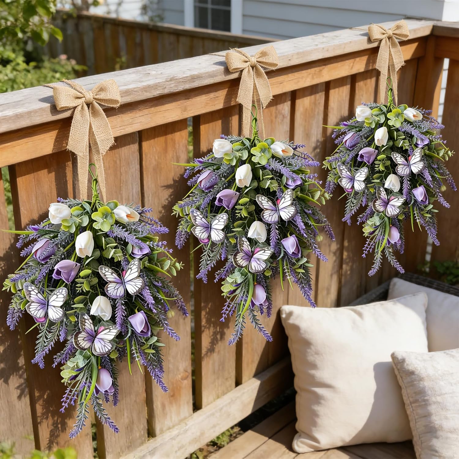 Features:The spring lavender tulips teardrop swag wreath is a meticulously crafted decorative piece designed to bring a fresh, vibrant spring aesthetic to any space. The white tulips crafted from high-quality, matte-finish synthetic fabric (likely polyester or PE plastic) to mimic the soft, velvety texture of real tulip petals. They feature a subtle yellow center detail for realism. The purple tulips made from the same durable synthetic material, available in a rich lavender and deep violet gradient, adding depth and contrast to the arrangement. Artificial lavender sprigs composed of fine, textured plastic or silk florets on green plastic stems, replicating the delicate, spiky appearance of fresh lavender. The color is a vibrant, true purple that evokes a spring garden, slender, grass-like stems fill in gaps, creating a dense, natural look. Three dimensional butterflies are integrated into the design. They are constructed from lightweight, printed plastic or fabric, featuring intricate wing patterns in white, purple, and black, with a subtle sheen to catch the light. All elements are designed to be weather-resistant, low-maintenance, and long-lasting, retaining their vibrant colors and shape without wilting or fading. This combination of materials creates a realistic, high-quality appearance that balances natural beauty with the practicality of artificial decor.Specifications:Material: Iron wire, Foam, PlasticSize: about 55cm/22 inches height (expanded)Package includes:2 x Purple swag teardrop wreaths1 x Linen ribbonNotes:Manual measurement, please allow slight errors on size.The color may exist a slight difference due to different screen displays