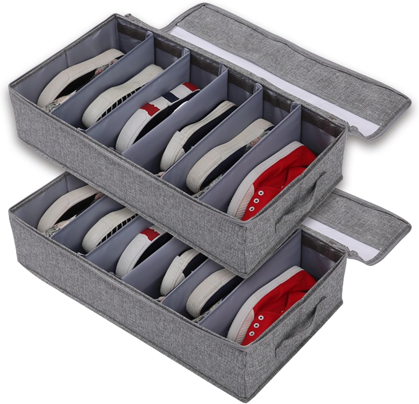 Contains two under bed storage boxes, Foldable, Adjustable dividers, double zipper, Transparent window, fully functional, it is widely used under beds, sofas, cabinets, and cribs, maximizing the use of unused space. Keep your home clean and tidyProduct Features:1. Durable material: Cotton and linen material2. Partitioned storage: 5 adjustable compartments3. Foldable: Foldable into a flat shape4. Transparent: Top long transparent window5. Zipper: Smooth-pulling double zippersProduct Specifications:Material: Cotton and linen materialColor: Gray , Beige , Brown , GreenSize:L 24 x W 12 x H 6 inPacking list: Under bed storage containers x 2