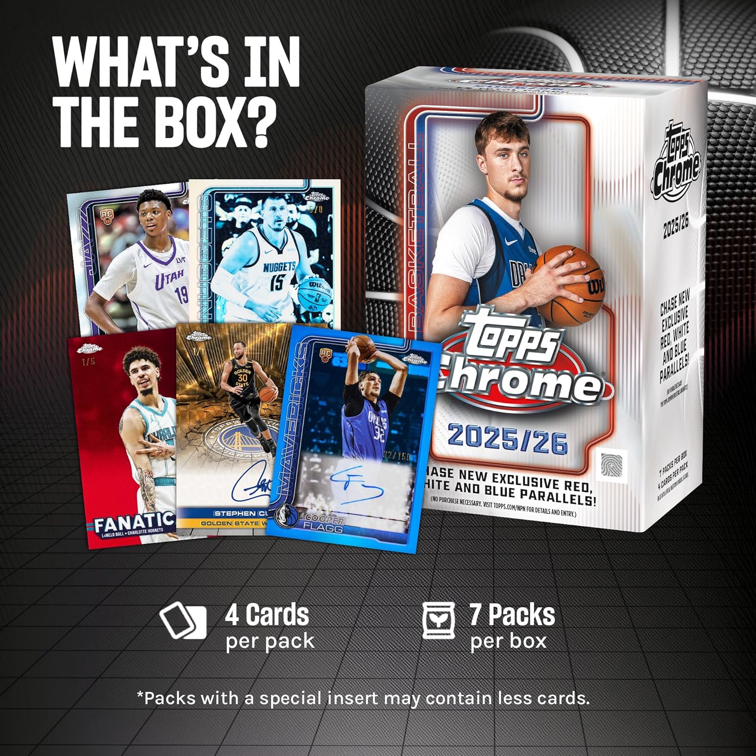 Topps Chrome Basketball is back and better than ever! Build the full 299-card Base Set, bursting with a rainbow of color and tech parallels featuring the NBA’s top rookies, star veterans, and iconic legends. Introducing an all-new lineup of inserts, including Activators, Serenity, Go Time and More. Plus, chase autographs from some of the hottest names in the game—Cooper Flagg, Dylan Harper, Ace Bailey, LeBron James, Stephen Curry, Victor Wembanyama, and more. Collectors can also look for ultra-rare SSP hits and inserts such as Ultra Violet, Helix, Glass Canvas, Advisory, Paradox, and Patented. The ultimate chase: Gold NBA Logoman Relics. Each card features a Gold NBA Logoman patch #/4 from early-season jerseys worn by the league’s three top award winners: MVP Shai Gilgeous-Alexander, Rookie of the Year Stephon Castle, and Defensive Player of the Year Evan Mobley. Look for on-card 1-of-1 autograph variations—the crown jewel of the collection.