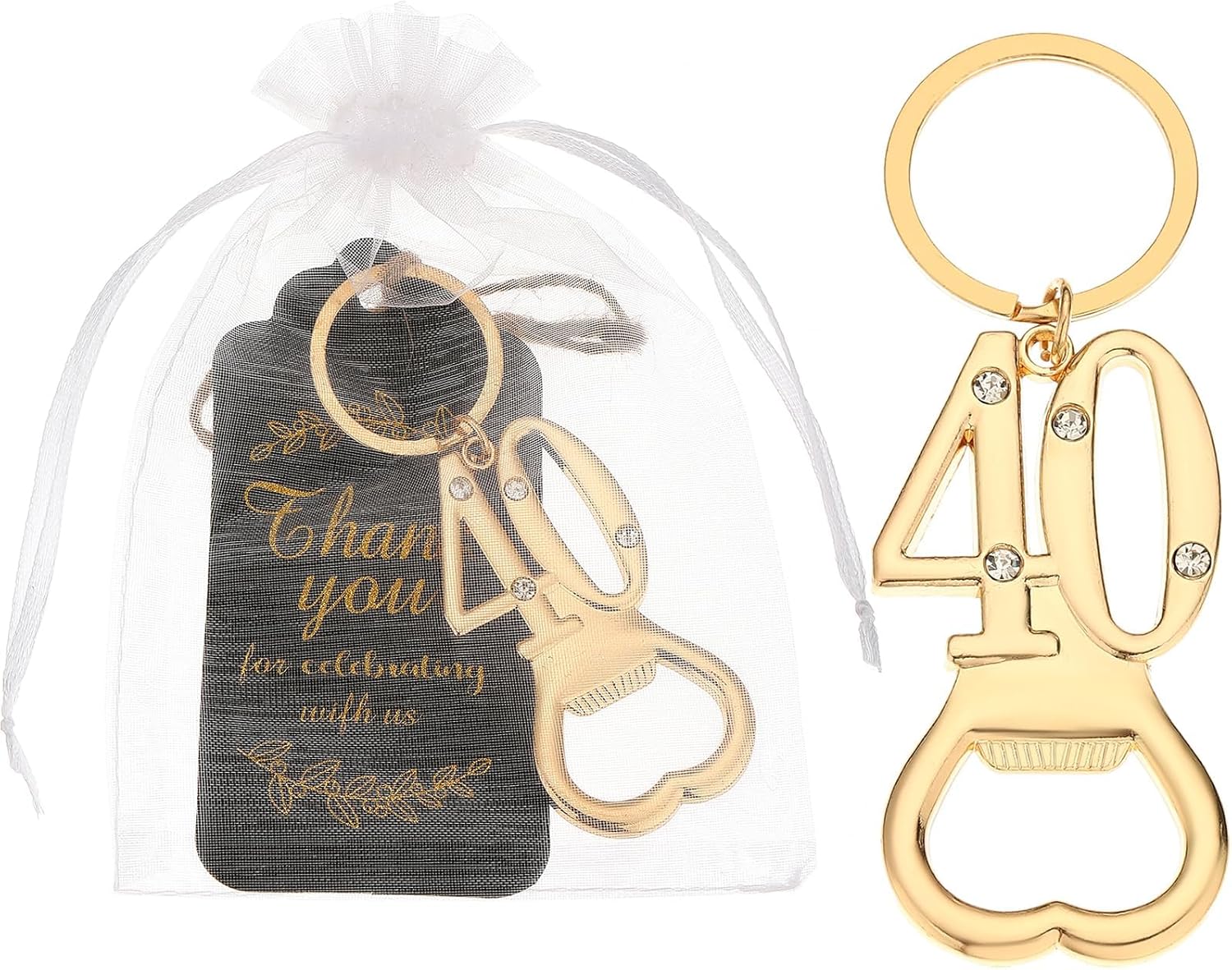 Celebrate an extraordinary milestone with these elegant 85-shaped bottle opener keychains, designed to combine style, sentiment, and everyday functionality. The gold finish paired with subtle rhinestone accents creates a refined look that perfectly complements your 85th birthday celebration.Crafted from high-quality zinc alloy, each bottle opener keychain is solid, durable, and designed for long-lasting use. The compact size and comfortable weight make this small bottle opener easy to carry and convenient for daily use.Each set includes 25 bottle opener keychains, 25 white organza bags, 25 thank-you tags, and twine—everything you need to create a coordinated and thoughtful party favor presentation without extra effort.These 85th birthday party favors are more than decorations—they are practical gifts your guests will truly appreciate. Whether used as a key chain bottle opener, a bottle opener bulk favor, or a meaningful keepsake, they combine functionality with lasting memories.SpecificationsWeight: 26g Material: Zinc Alloy Shape: 85 Skeleton Key Color: Gold Size: 3.77 x 1.41 inchesPerfect for birthday parties, family gatherings, and milestone celebrations, these bottle opener party favors add both elegance and practicality to your event, leaving your guests with a keepsake they can use every day.