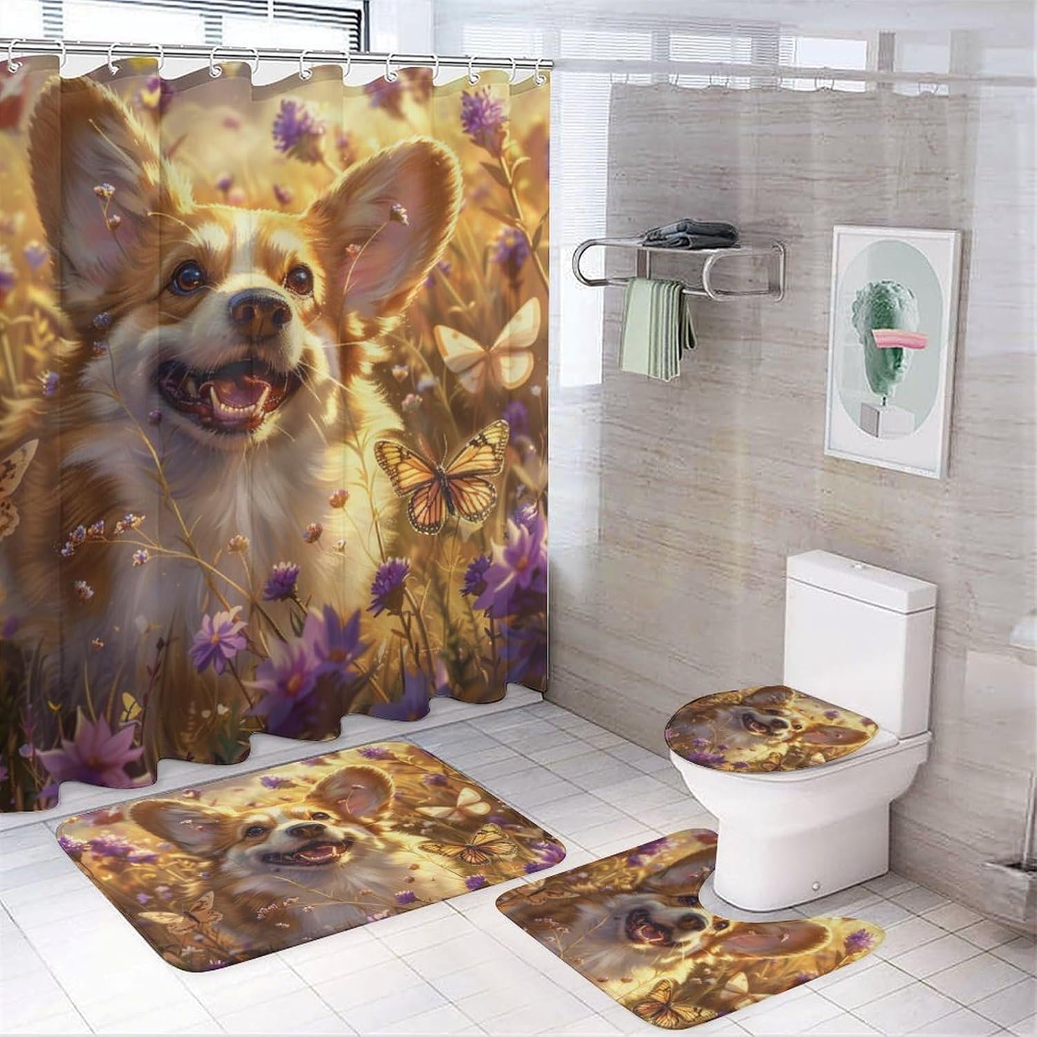 We're dedicated to enhancing your bathroom and creating a cozy atmosphere for your home.We believe your bathroom should be a haven of relaxation, where you can unwind after a long day.Our shower curtain sets with rugs not only offer a visual feast but also add warmth to your bathroom. Step into a world of shower curtain patterns as you soak away the day's stress and worries.Package Includes: Waterproof shower curtain: 72"L x 72"WO shape toilet lid cover: 18"L x 16"WNon-slip flannel bathroom mat: 30"L x 18"WU shape rug: 20"L x 20"WOur shower curtain sets have been enlarged and thickened for maximum comfort, suitable for most family bathrooms.Warm Tips:Machine wash, hand wash, or wipe with a damp cloth.Wash the shower curtain in water below 30°C, ironing within 100°C.Avoid tumble drying, dry cleaning, or bleaching.Please allow a deviation of 1-2cm due to manual measurement.Colors may vary slightly due to different computer display settings.