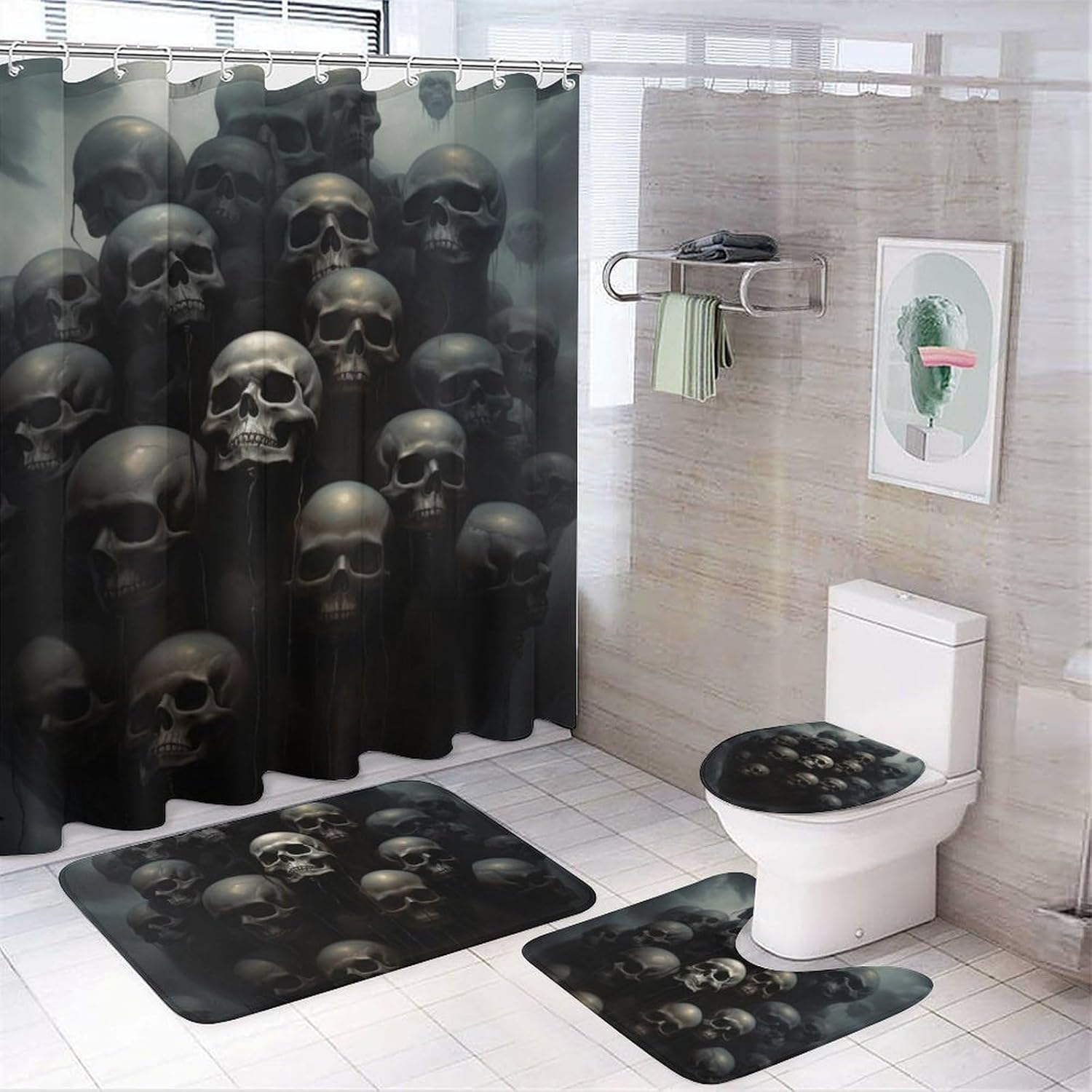 Welcome to my store! We hope to decorate each room with a unique style and create beautiful home decor.Accessories construction : Shower curtain (with 12 C-shaped plastic hooks)+Floor mat+U-shaped floor mat+Toilet seat cover cover.EASY TO CLEAN: It's very easy to clean and maintain,easy to store and easy to take care of on a daily basis. WATERPROOF: This shower curtain is made of waterproof Oxford cloth, waterproof performance is good, you can avoid water spraying to other places in the bathroom.Applicable Scenarios : Suitable for home bathroom, guest room, bedroom, living room and other places.Washing instructions: washable, not machine washable.