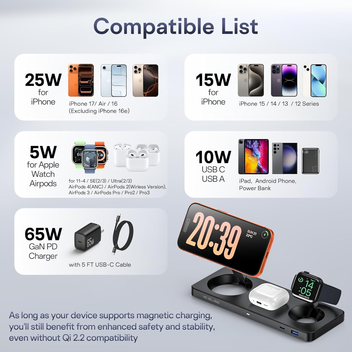 | Compatible Devices | AirPods 1 - 4 (Wireless / MagSafe / ANC Version) AirPods Pro Series, All iPad Series, Apple Watch 4-11 Series & SE Series & Ultra Series, USB Devices, iPhone 12-17 & Air Series (Excluding iPhone 16e) |