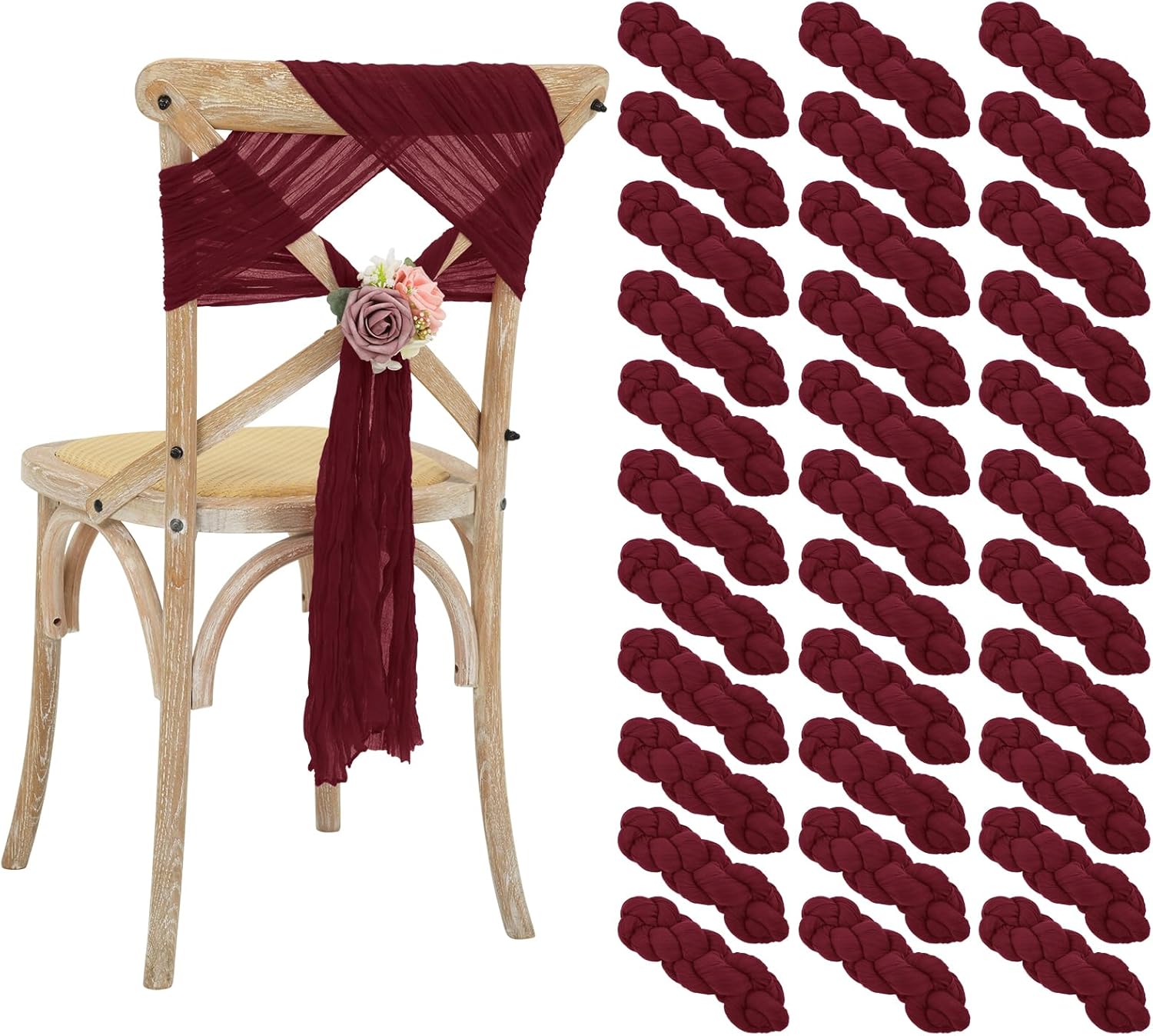 50 Packs Light Pink Cheesecloth Chair Sashes, Country Style Chair Sashes Aisle Decorations for Wedding Chair DecorationsProduct Description:Quantity: 50 Packs Chair Sashes (Flowers are not included in the package)Color: Light PinkMaterial: High Quality Cheesecloth FabricSize: 40 x 180cm/15 x 70inchUsage Scenarios: Our chair ribbons are perfect for wedding party, banquet, birthday, baby shower.Care instructions: 1. Do not dry clean, do not use bleach.2. Hand wash or machine wash in a laundry bag, lay flat to dry.3. premium-grade cheesecloth chair ties is highly resistant to stains and simple machine-wash care allows for repeated use at many different functions.Warm Notice:1. Manual measurement, there will be an error of 1-2cm.2. The color of the display screen of mobile phone and computer is different, there will be color difference, please understand.3. If you have any questions about the purchase or use of the product, we will provide you with solutions to solve the problem.