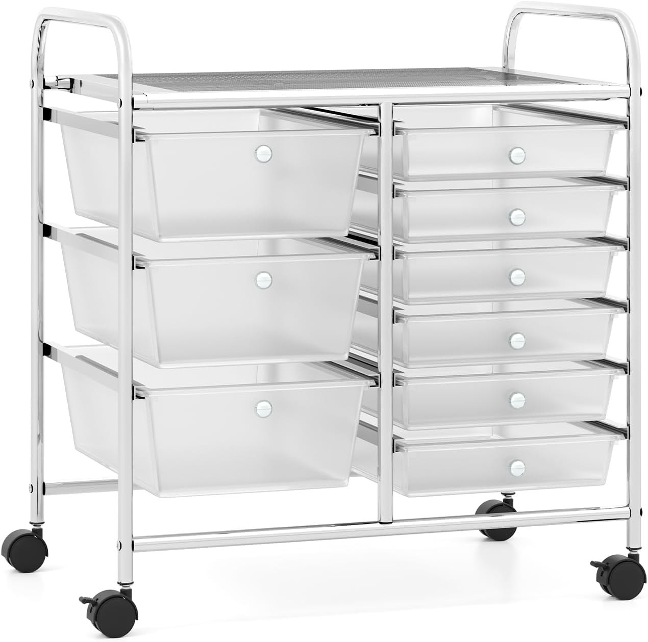 Description:Keep your space tidy and organized with the SILKYDRY 9 Drawer Organizer Cart – the ultimate storage solution for your home or office!Designed with versatility and functionality in mind, this craft drawers organizer storage unit boasts 9 removable drawers, consisting of 3 large drawers and 6 small drawers, allowing you to neatly categorize and store a wide array of items. Thanks to its 360° swivel wheels, including 2 lockable ones, this rolling drawer cart glides smoothly across various floor surfaces. Constructed with a robust galvanized metal frame and premium PP plastic drawers, this art drawer organizer is built to endure daily wear and tear. Whether it's for classrooms, schools, offices, living rooms, studies, or art studios, this versatile organizer cart can cater to your storage needs efficiently.Features:9 drawers offer abundant storage capacity for organizing various-sized items efficientlyPerfect for classrooms, schools, offices, living rooms, studies, or art studiosEffortless retrieval of stored items with smooth drawer operation for convenienceProvides durability to withstand daily use and ensures long-lasting storage solutionEasy to move around for convenient repositioning and transportationEffortless mobility across different floor surfaces for flexible placement optionsEnsures cart remains securely in place when needed, preventing unwanted movementsProvides functional storage solutions for various items, keeping different spaces clutter-free and tidySpecification:Color: As picture showsMaterial: Metal, PPProduct Dimension: 25" x 14.5" x 24.5" (L x W x H)Large Drawer Dimension: 14.5" x 11.5" x 5" (L x W x H)Small Drawer Dimension: 14.5" x 11.5" x 2.5" (L x W x H)Weight Limit of Tabletop : 22 lbsWeight Limit of Large Drawer: 5.5 lbsWeight Limit of Small Drawer: 3 lbsNet Weight: 11 lbsPackage Includes:1 x 9 Drawer Rolling Storage Cart1 x InstructionsWhy You Choose Our SILKYDRY 9 Drawer Rolling Cart?The SILKYDRY 9 Drawer Organizer Cart combines durability, functionality, and style to provide a reliable storage solution for any space. Its easy-to-move design, sturdy construction, and versatile storage options make it a must-have for anyone looking to declutter and organize their home or workspace.