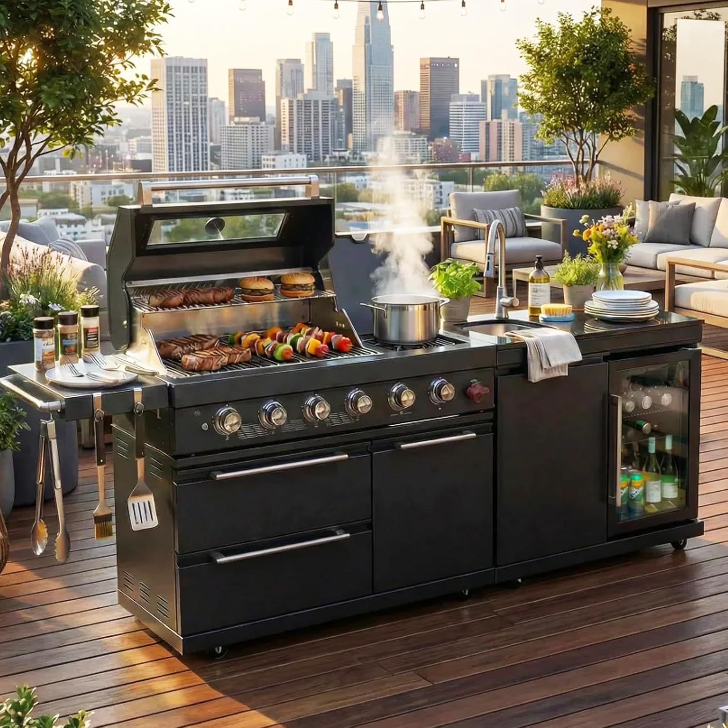 | Included Components | Stainless Steel Gas Grill, Beverage Fridge, Granite Countertops, Rotisserie Oven Kit, Stainless Steel Sink |