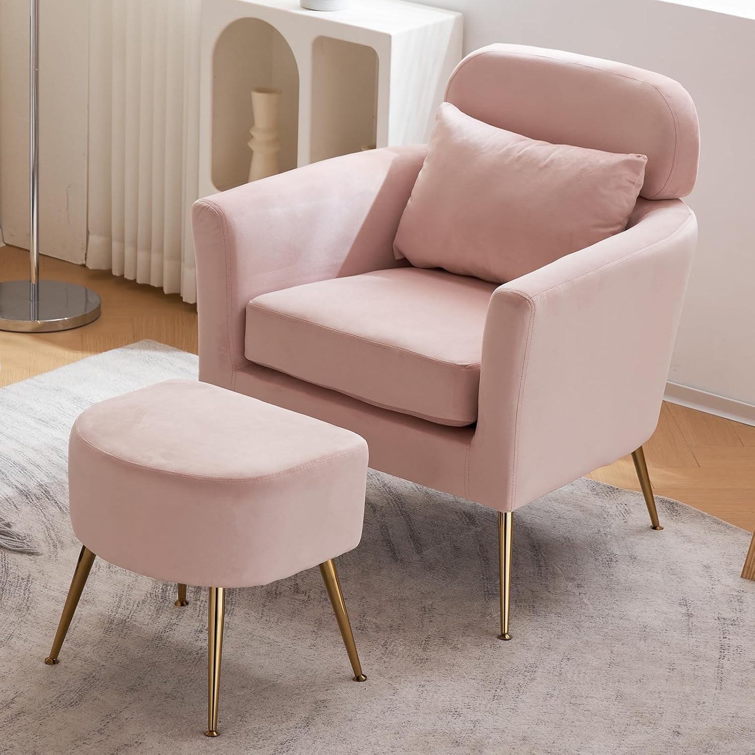 This chair with ottoman seamlessly combines functionality with contemporary design elements, making it a standout addition to any living space.Supported by sleek metal legs, this accent chair showcases a perfect blend of durability and modernity.To enhance your lounging experience, this accent chair comes with an ottoman.The ottoman provides a convenient place to rest your feet, allowing you to kick back and truly indulge in relaxation.Whether you're looking to create a cozy reading nook, a stylish seating area, or simply want to add a touch of sophistication to your living space, this bedroom chair is the perfect choice.Specifications:Dimensions: (28.35 x 27.17 x 32.28)" / (72 x 69 x 82)Cm(L x W x H)Fabric Material: Orange Bronzing ClothFeet: Gold-Plated Adjustable FeetWeight: 42.33Lbs / 19.2kgWeight Capacity: 330 lbsPackage Includes:1 x chair with ottoman