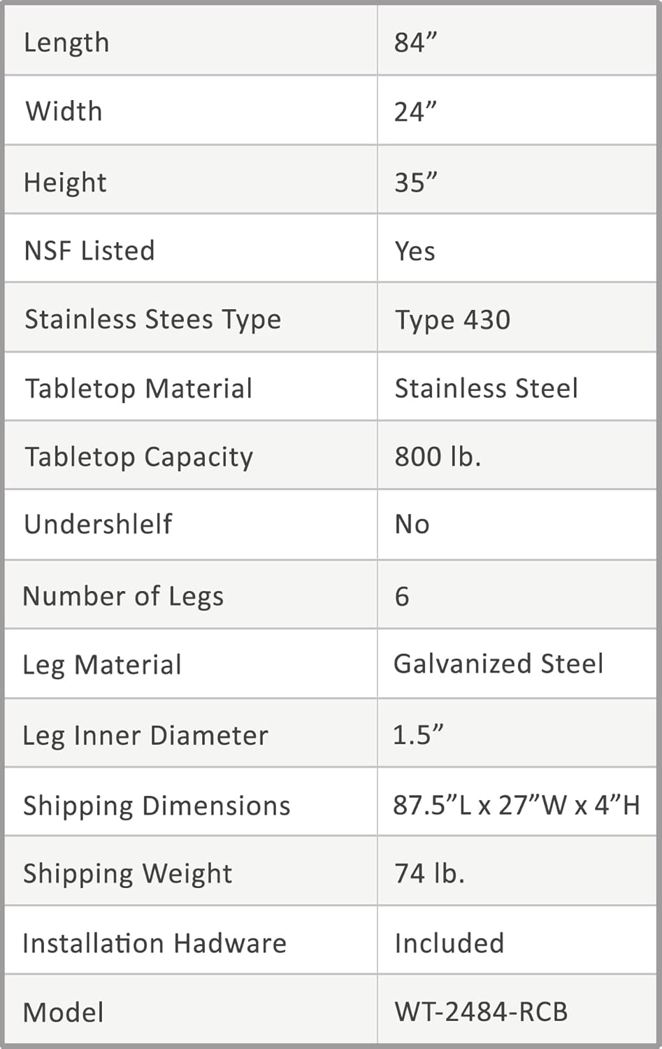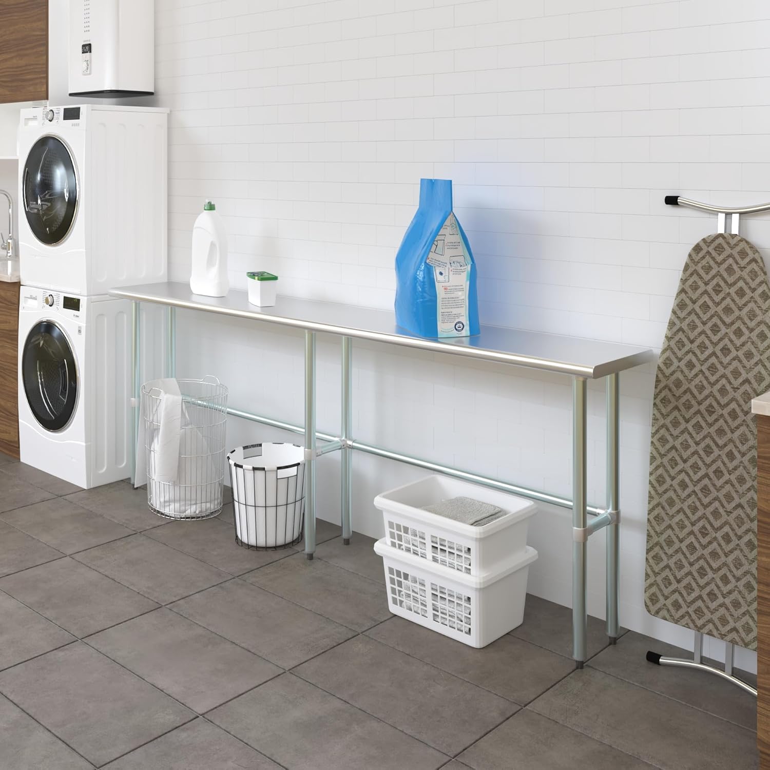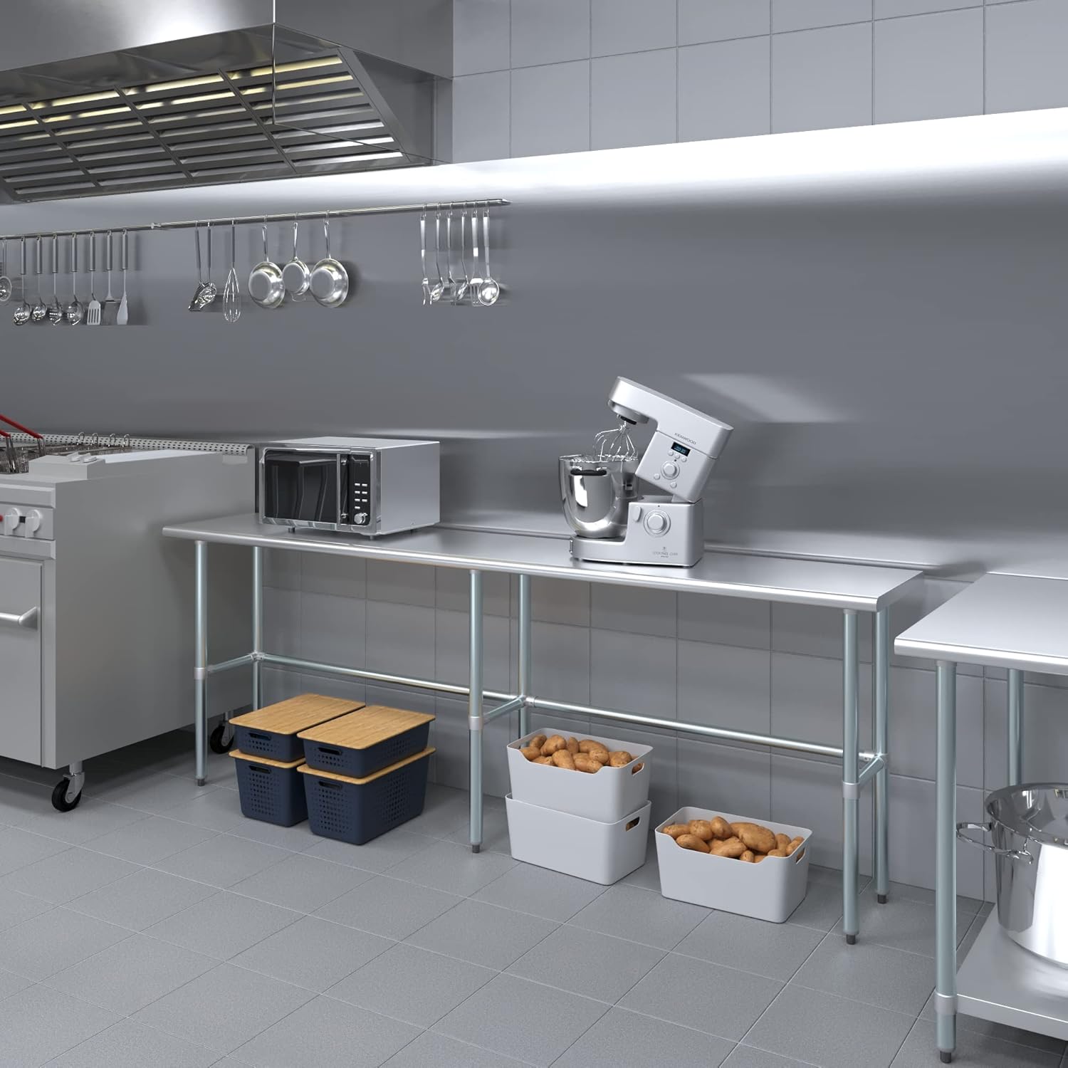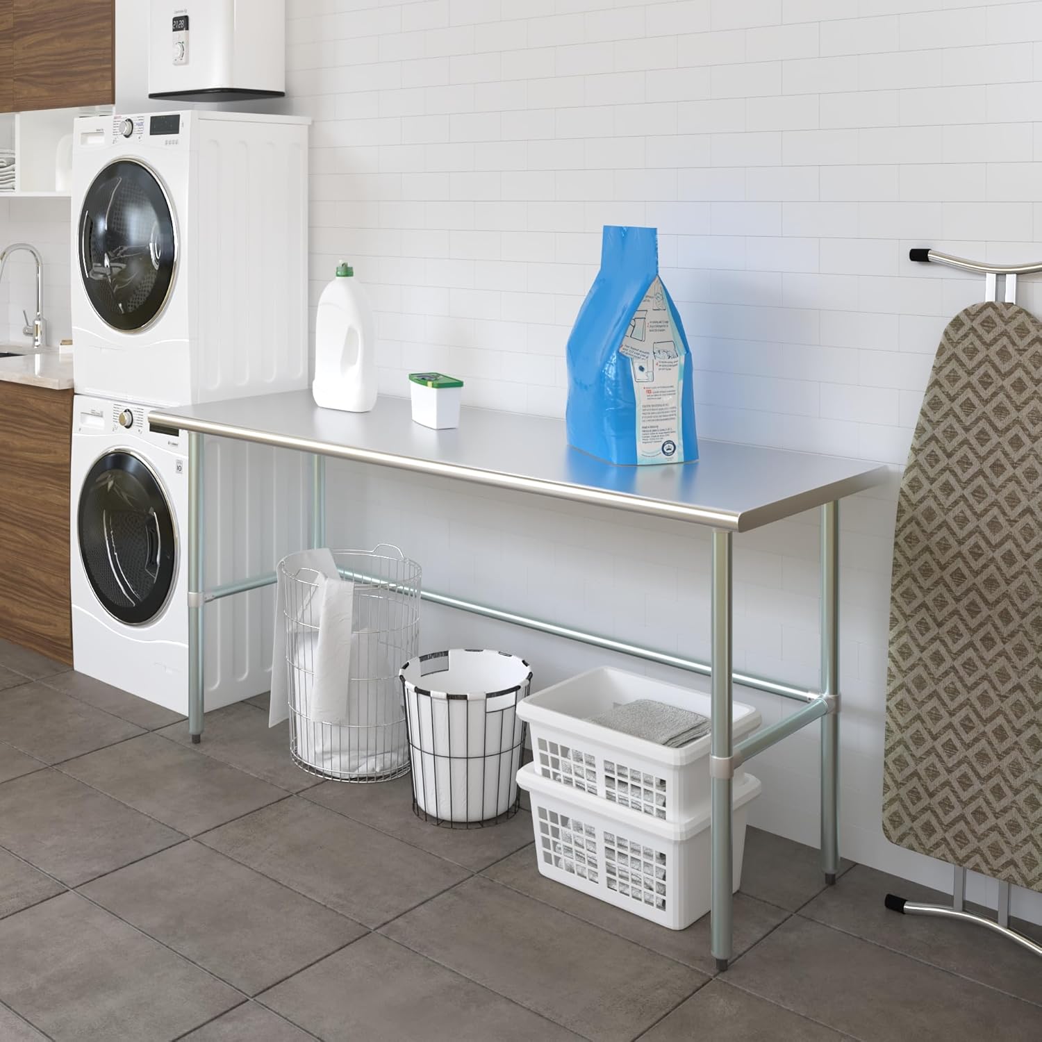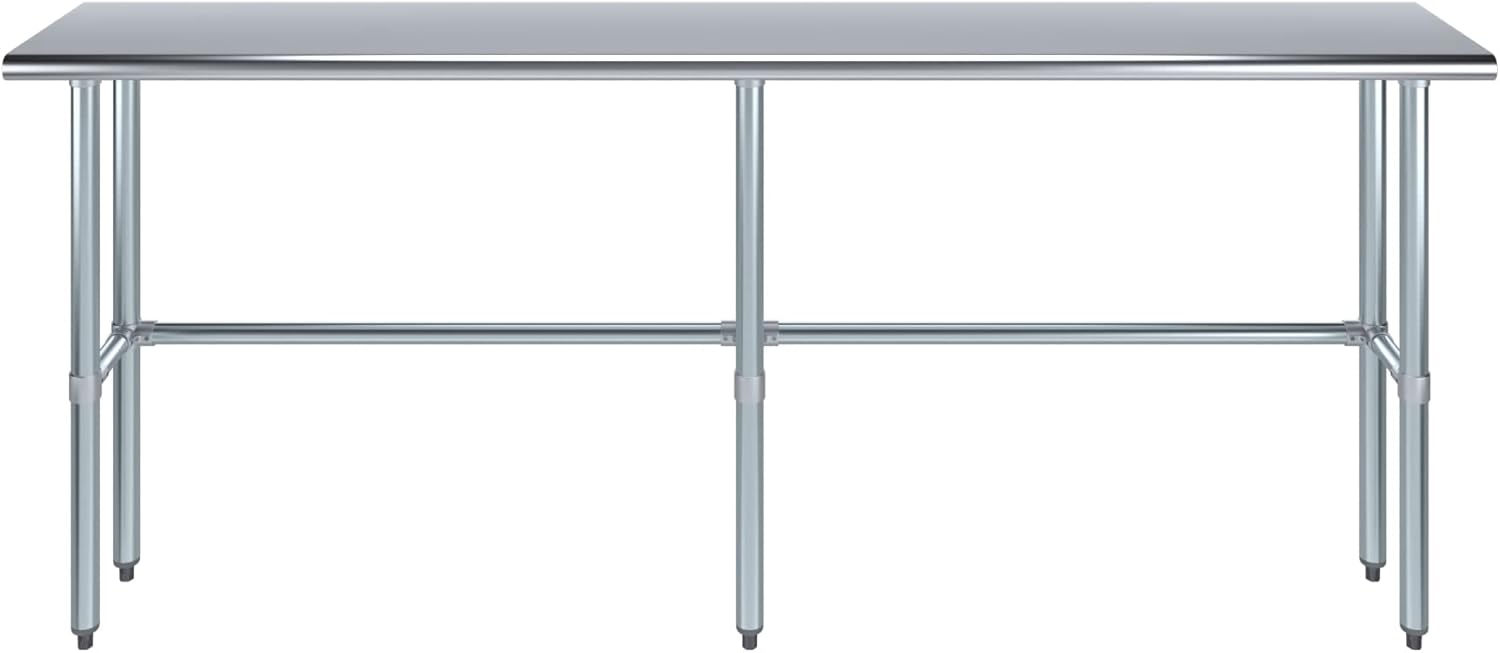 An open base stainless steel utility work table is a great addition to any home or business. It is perfect for a variety of tasks, including a workbench, prep table, or general-purpose table. Open base allows to store equipment and supplies with plenty of clearance. Some assembly is required.NSF certification allows the table to be used in any food service environment.The table is made with corrosion resistant 430 stainless steel top and galvanized legs and cross bars. It's built to withstand heavy use and everyday wear and tear. Whether you need a sturdy workspace for your next DIY project or simply want an extra prep area in the kitchen, this utility table has you covered.Common Applications:Food Prep Table For Commercial KitchenKitchen IslandCounter ExtensionUtility Bench for ShopProfessional Work StationGarage Work BenchLaundry Clothes Folding TableBrewing SetupExam Table For VeterinariansButcher ShopProduct SpecificationsStainless steel work table surface has curved edges for safety and comfort. It incorporates galvanized cross bars to add stability and leveling feet.18 Gauge 430 Stainless Steel TopAdjustable feet to compensate for uneven floorOpen base design - great for storageHeight: 35:NSF CertifiedSturdy & easy to setupHeavy Duty