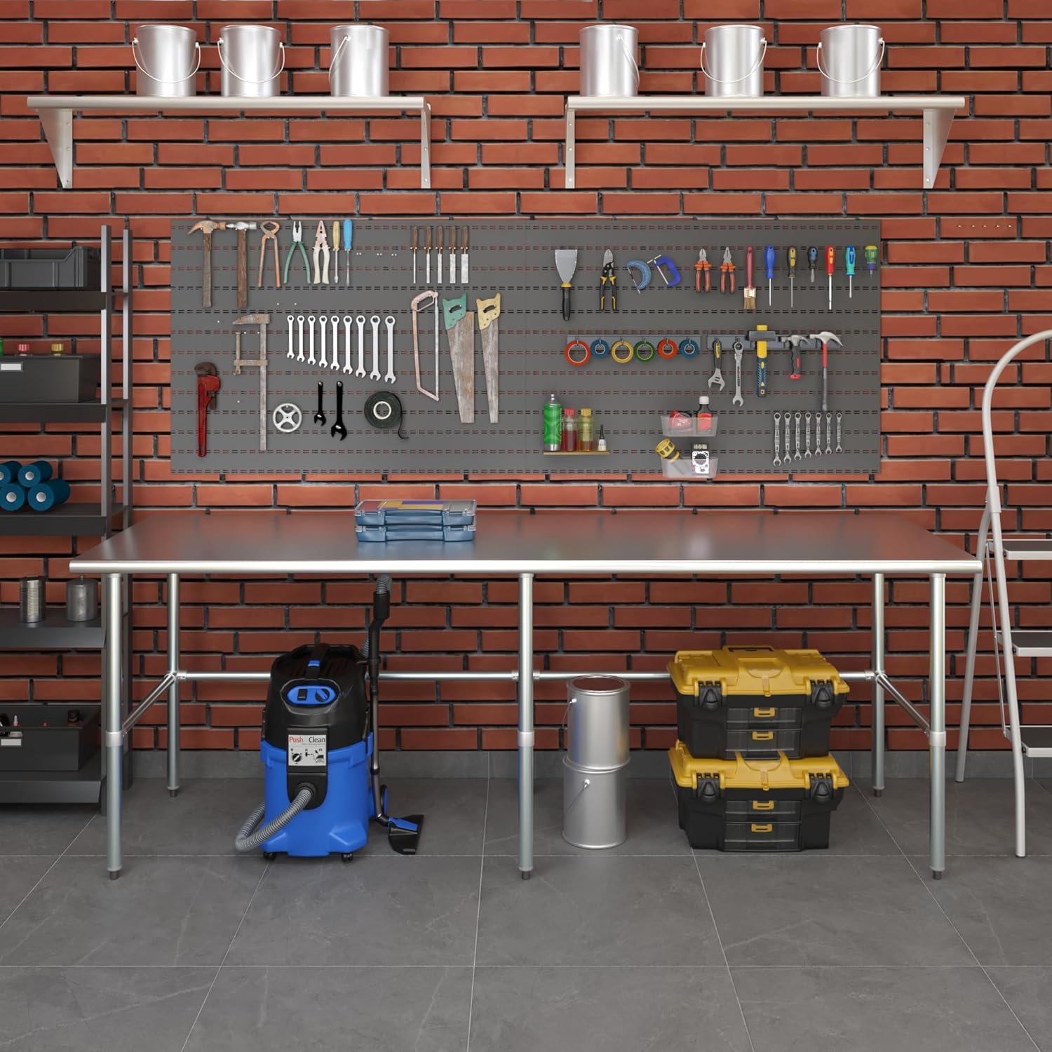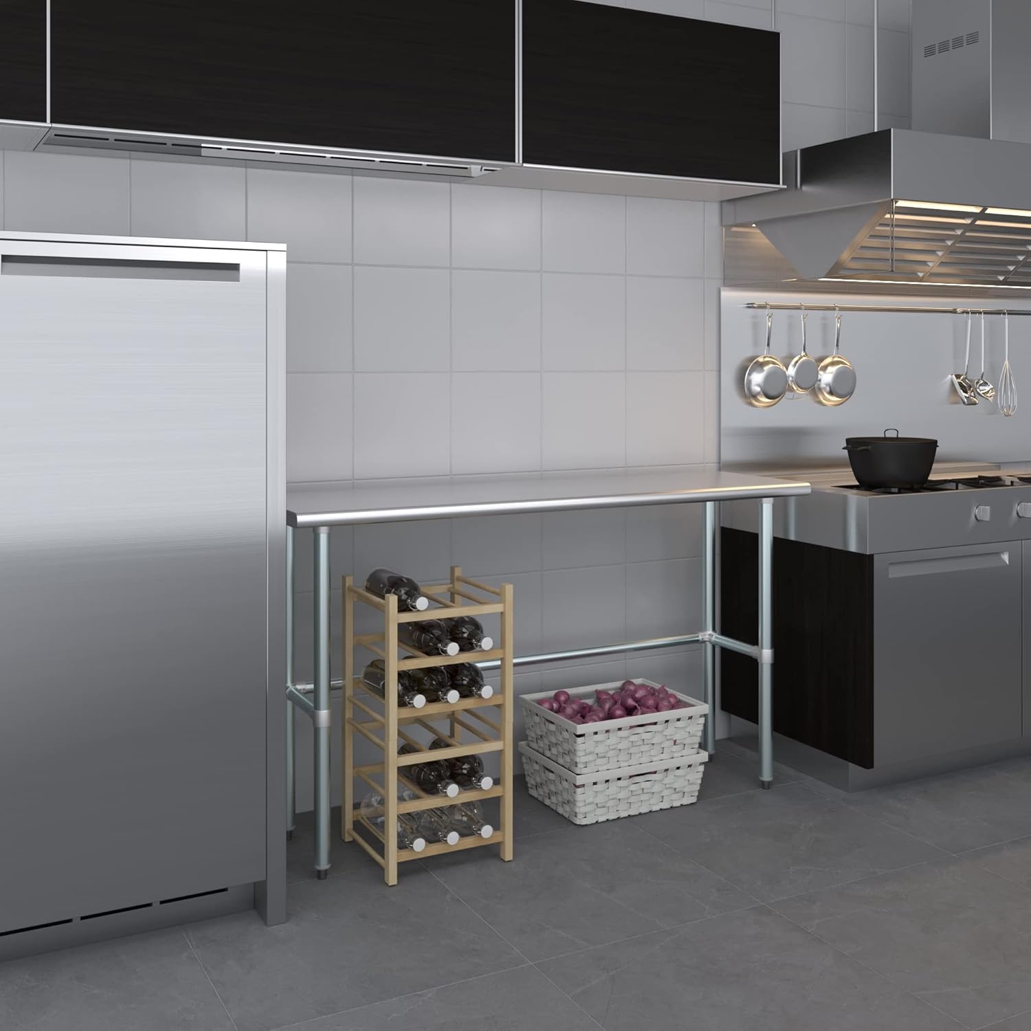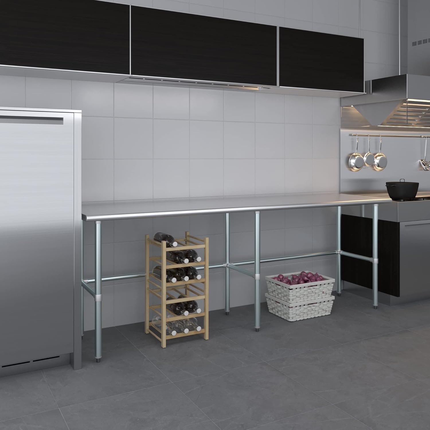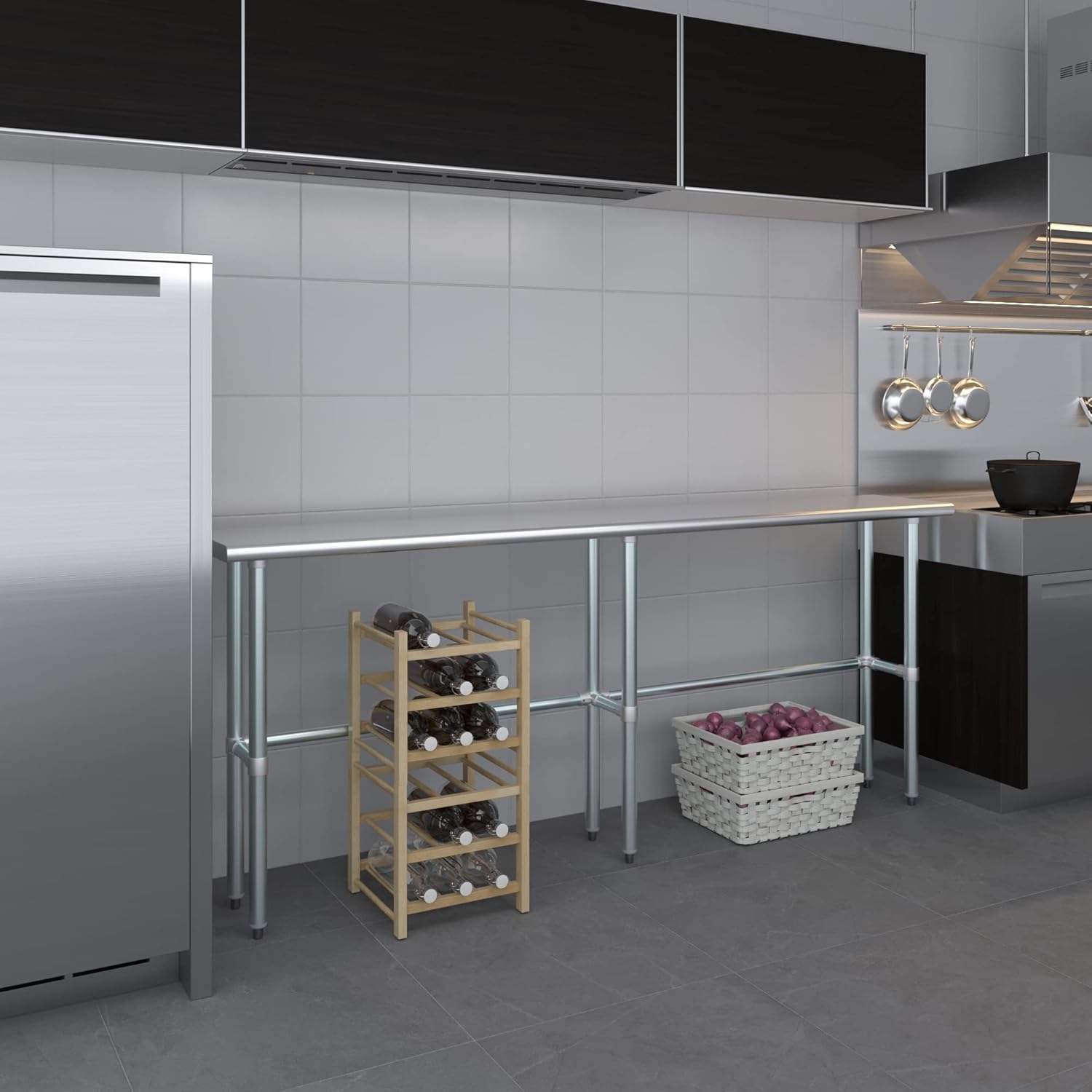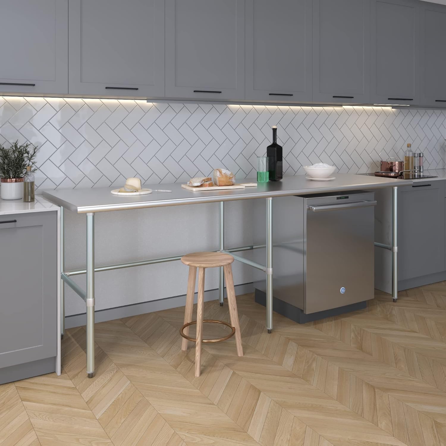 An open base stainless steel utility work table is a great addition to any home or business. It is perfect for a variety of tasks, including a workbench, prep table, or general-purpose table. Open base allows to store equipment and supplies with plenty of clearance. Some assembly is required.NSF certification allows the table to be used in any food service environment.The table is made with corrosion resistant 430 stainless steel top and galvanized legs and cross bars. It's built to withstand heavy use and everyday wear and tear. Whether you need a sturdy workspace for your next DIY project or simply want an extra prep area in the kitchen, this utility table has you covered.Common Applications:Food Prep Table For Commercial KitchenKitchen IslandCounter ExtensionUtility Bench for ShopProfessional Work StationGarage Work BenchLaundry Clothes Folding TableBrewing SetupExam Table For VeterinariansButcher ShopProduct SpecificationsStainless steel work table surface has curved edges for safety and comfort. It incorporates galvanized cross bars to add stability and leveling feet.18 Gauge 430 Stainless Steel TopAdjustable feet to compensate for uneven floorOpen base design - great for storageHeight: 35:NSF CertifiedSturdy & easy to setupHeavy Duty