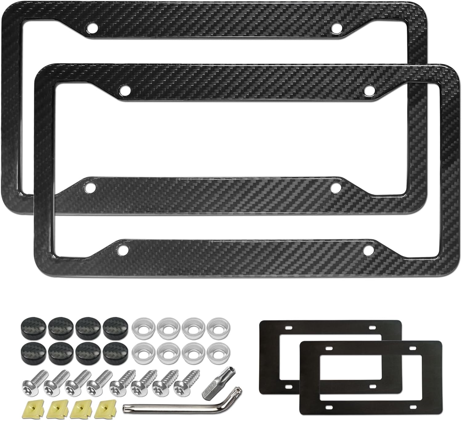 | Included Components | 2 pack license plate frames, anti theft license plate screws, carbon fiber license plate screw caps |