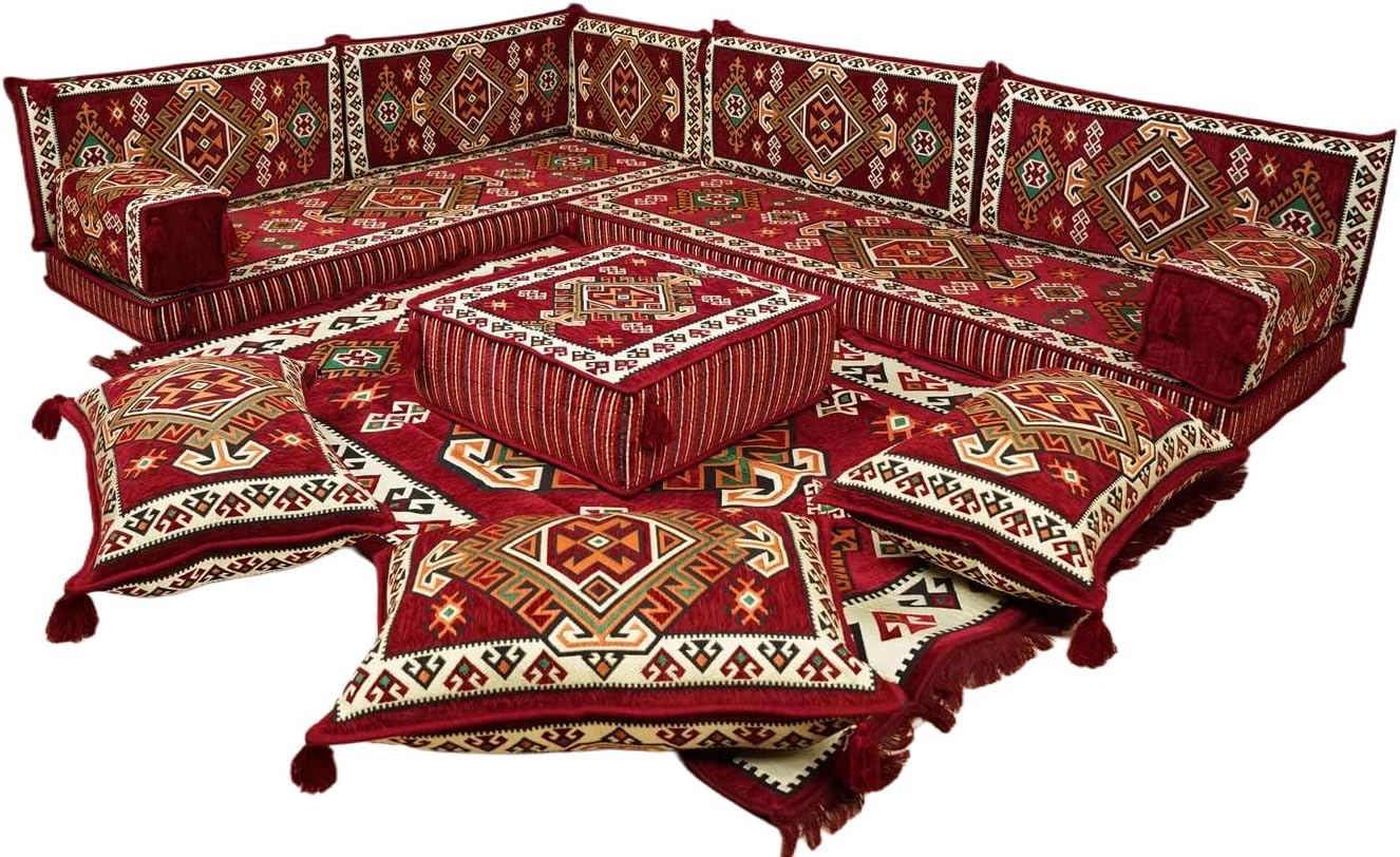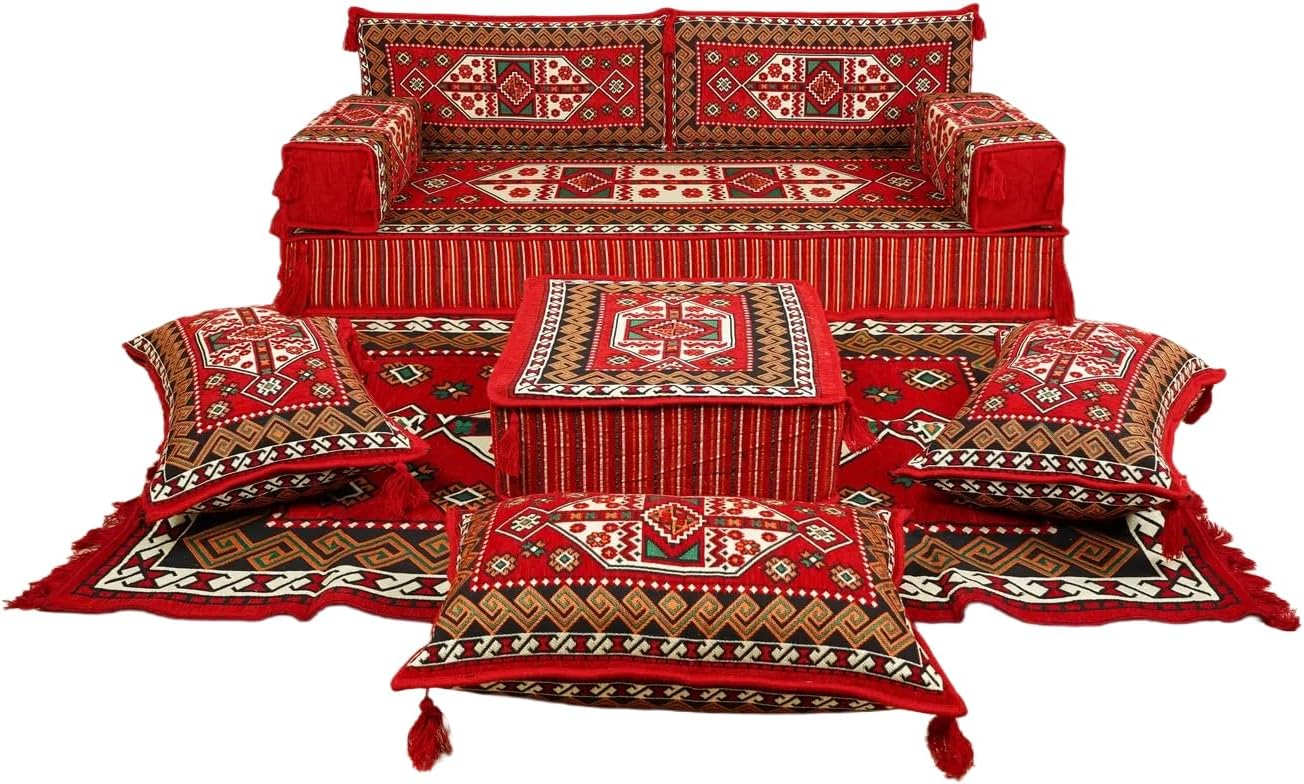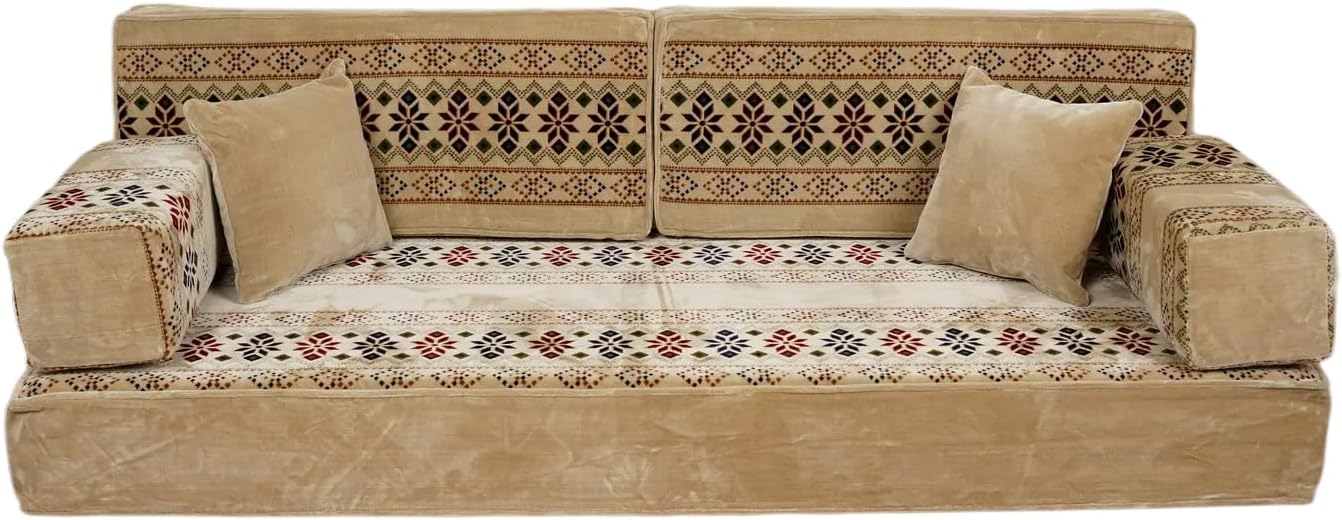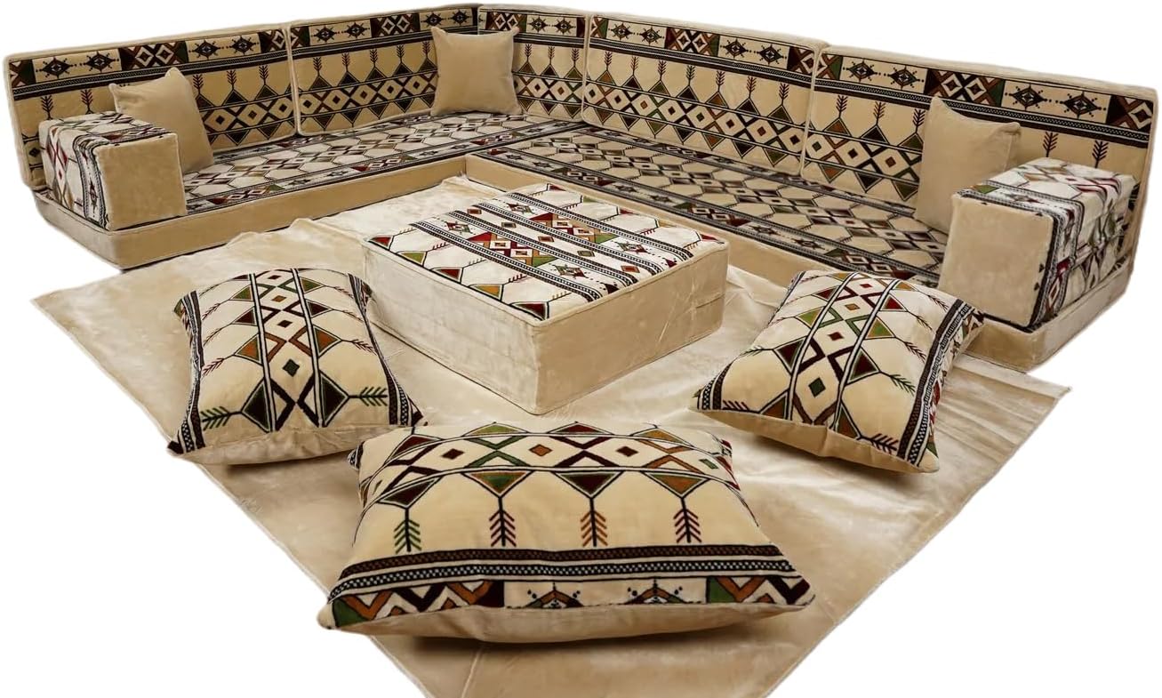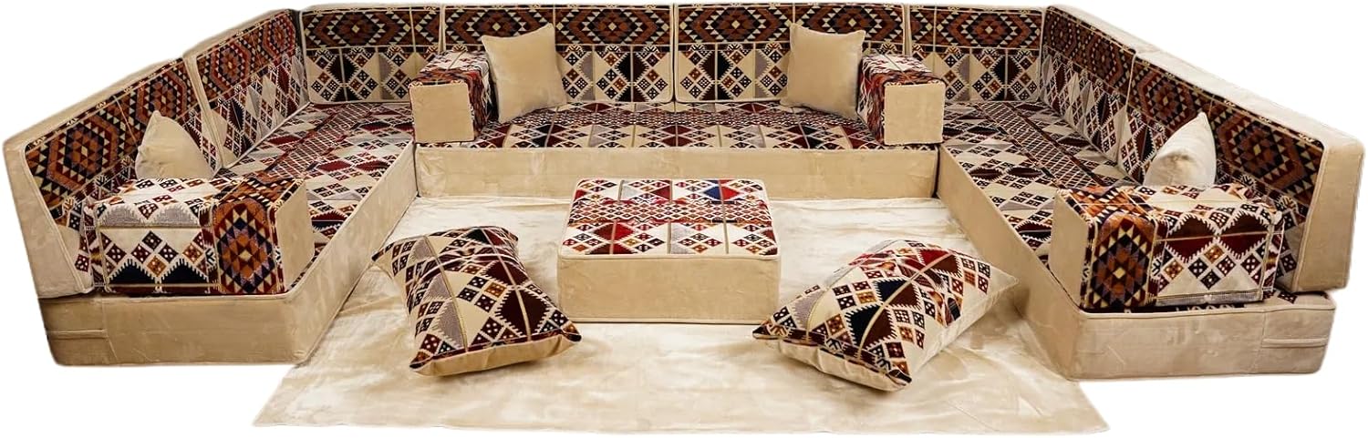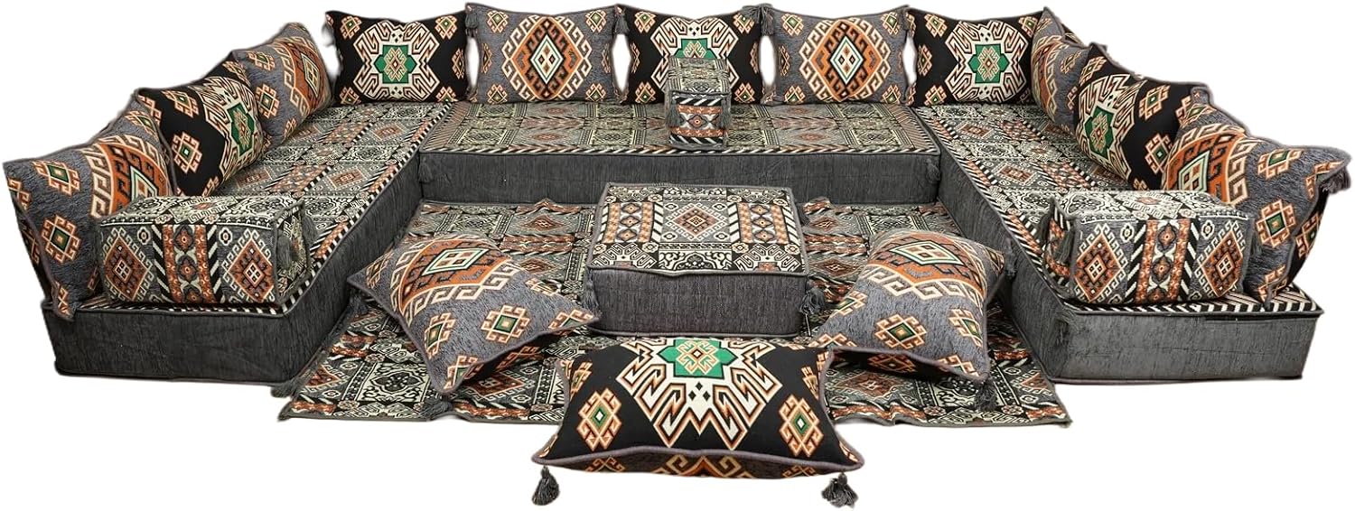 Bring elegance and comfort to your home with our Traditional Arabic Majlis Floor Sofa Set. Perfectly designed for floor seating, our handmade sofas embody the timeless beauty of Arabic furniture. Inspired by classic jalsa and majlis seating styles, this versatile floor couch offers a cozy and luxurious addition to your living room or lounge. The high-quality craftsmanship and luxurious cushions ensure comfort and durability, while the traditional Arabic design adds a cultural touch to any space.Please Note: You will receive the exact configuration and cushion thickness of the variant you select from the listing page.What’s Included in Your Set?If you choose 'U Sofa Full Set' you will get these:-3 Floor Seating Cushions (190 x 70 cm / 75 x 27 inch)-11 Backrest Pillows (70 x 50 cm / 27 x 20 inch)-3 Pouf Pillows (70 x 50 cm / 27 x 20 inch)-3 Armrest Pillows (50 x 20 x 20 cm / 20 x 8 x 8 inch)-1 Matching Rug (120 x 180 cm / 47 x 71 inch)-1 Ottoman Couch (60 x 60 x 20 cm / 24 x 24 x 8 inch)This sofa set comes in 22 separate pieces.If you choose 'L Sofa Full Set' you will get these:-2 Floor Seating Cushions (190 x 70 cm / 75 x 27 inch)-7 Backrest Pillows (70 x 50 / 27 x 20 inch)-2 Armrest Pillows (50 x 20 x 20 cm / 20 x 8 x 8 inch)-1 Matching Rug (120 x 180 cm / 47 x 71 inch)-1 Ottoman Couch (60 x 60 x 20 cm / 24 x 24 x 8 inch)-3 Pouf Pillows (70 x 50 cm / 27 x 20 inch)This sofa set comes in 16 separate pieces.If you choose 'Single Full Set' you will get these:-1 Floor Seating Cushion (190 x 70 cm / 75 x 27 inch)-3 Backrest Pillows (70 x 50 / 27 x 20 inch)-2 Armrest Pillows (50 x 20 x 20 cm / 20 x 8 x 8 inch)-1 Matching Rug (120 x 180 cm / 47 x 71 inch)-1 Ottoman Couch (60 x 60 x 20 cm / 24 x 24 x 8 inch)-3 Pouf Pillows (70 x 50 cm / 27 x 20 inch)This sofa set comes in 11 separate pieces.If you choose 'Loveseat Sofa' you will get these:-1 Floor Seating Cushion (190 x 70 cm / 75 x 27 inch)-3 Backrest Pillows (70 x 50 / 27 x 20 inch)-2 Armrest Pillows (50 x 20 x 20 cm / 20 x 8 x 8 inch)This sofa set comes in 6 separate pieces.The thickness of the FLOOR SEATING CUSHIONS will be based on the variant you choose from the listing page: 4" Thickness (10 cm) or 8" Thickness (20 cm)