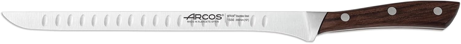 Introducing the Arcos Series Natura Bread Knife - a must-have for any bread lover who wants to enjoy perfectly sliced bread every time! This knife is part of the Natura series, which is known for its unique blend of wood and steel, making it a favorite among the most demanding customers. The blade of this bread knife is made of NITRUM forged stainless steel, which is extremely hard and offers superior cutting ability. It is also highly resistant to rust and wear, ensuring that it will last for years to come. The blade is 8 inches long, making it the perfect size for slicing through all types of bread with ease. One of the standout features of this knife is its beautiful rosewood handle. The handle is not only aesthetically pleasing but also provides a comfortable grip for easy handling. The handle is made of noble rosewood with an excellent finish, making it a pleasure to hold and use. The handle's personal shape with daring lines adds to the knife's unique design. The knife's stainless steel cutler's rivets guarantee high resistance to corrosion, ensuring that the knife remains in top condition even after years of use. The knife comes in a case, making it easy to store and transport. In summary, the Arcos Series Natura Bread Knife is a high-quality, durable, and beautiful knife that is perfect for slicing through all types of bread. Its unique design, superior cutting ability, and high resistance to rust and wear make it a must-have for any kitchen. So, if you're looking for a reliable and stylish bread knife, look no further than the Arcos Series Natura Bread Knife!