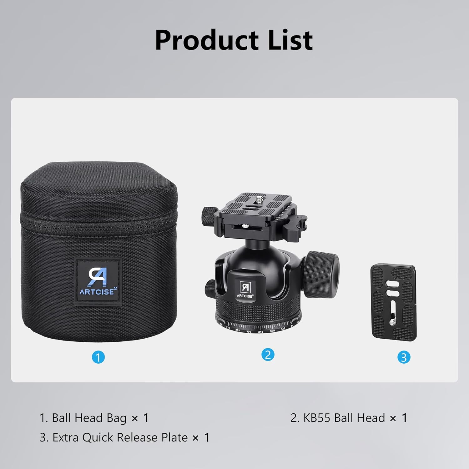 ARTCISE KB55 55mm Low Profile Ball Head with Lever Release, CNC Metal Panoramic Tripod Head with Two Arca Swiss Quick Release Plate, Heavy Duty Camera Mount Max Load 88lbs/40kg