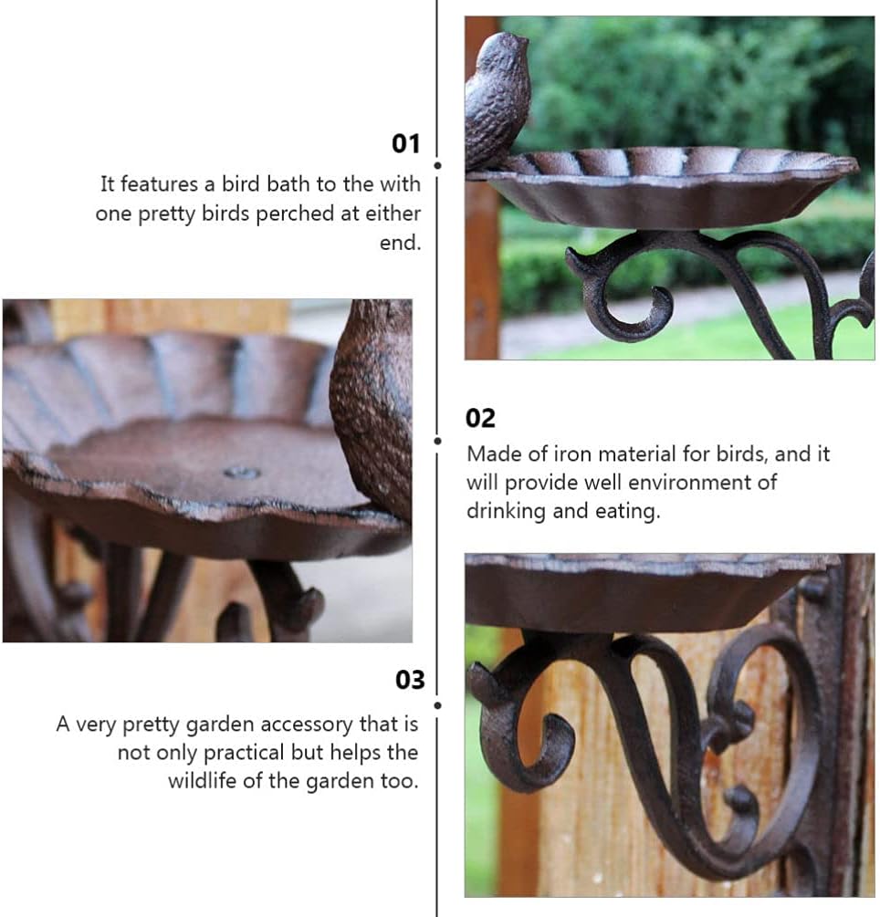Description Cast Iron Birdbath with Wall Bracket Plant Hanging Hooks Bird Feeder Bowl Wall Plant Bracket Rustic Iron Hooks for Planter Lantern Plant Pot Gardening Indoor Outdoor Features- Material: Iron.- Color: As Shown.- Size: . 00X22. 20X15. 00cm 9. 43X8. 72X5. 89inch. Package Including 1 x Bird Feeder