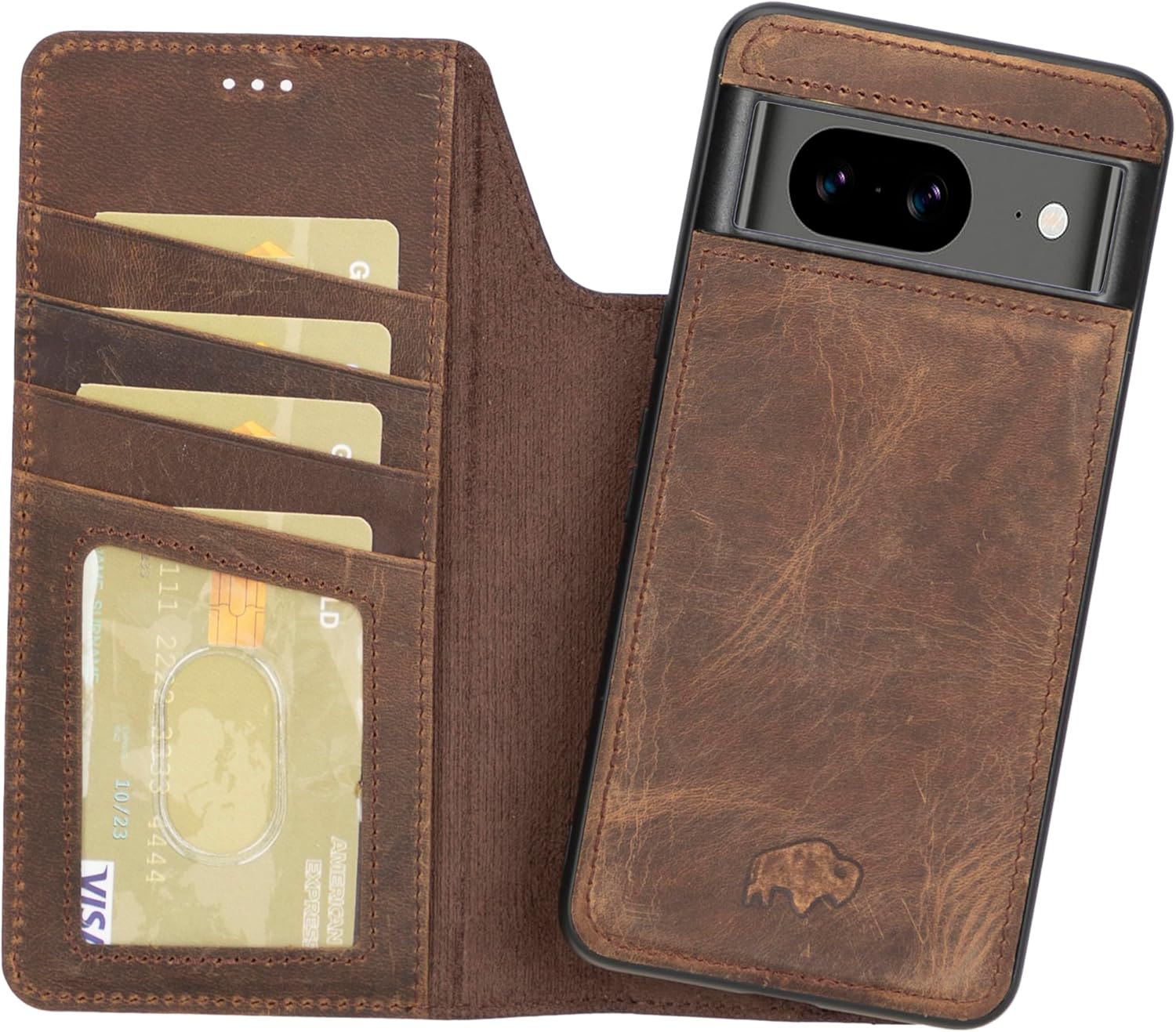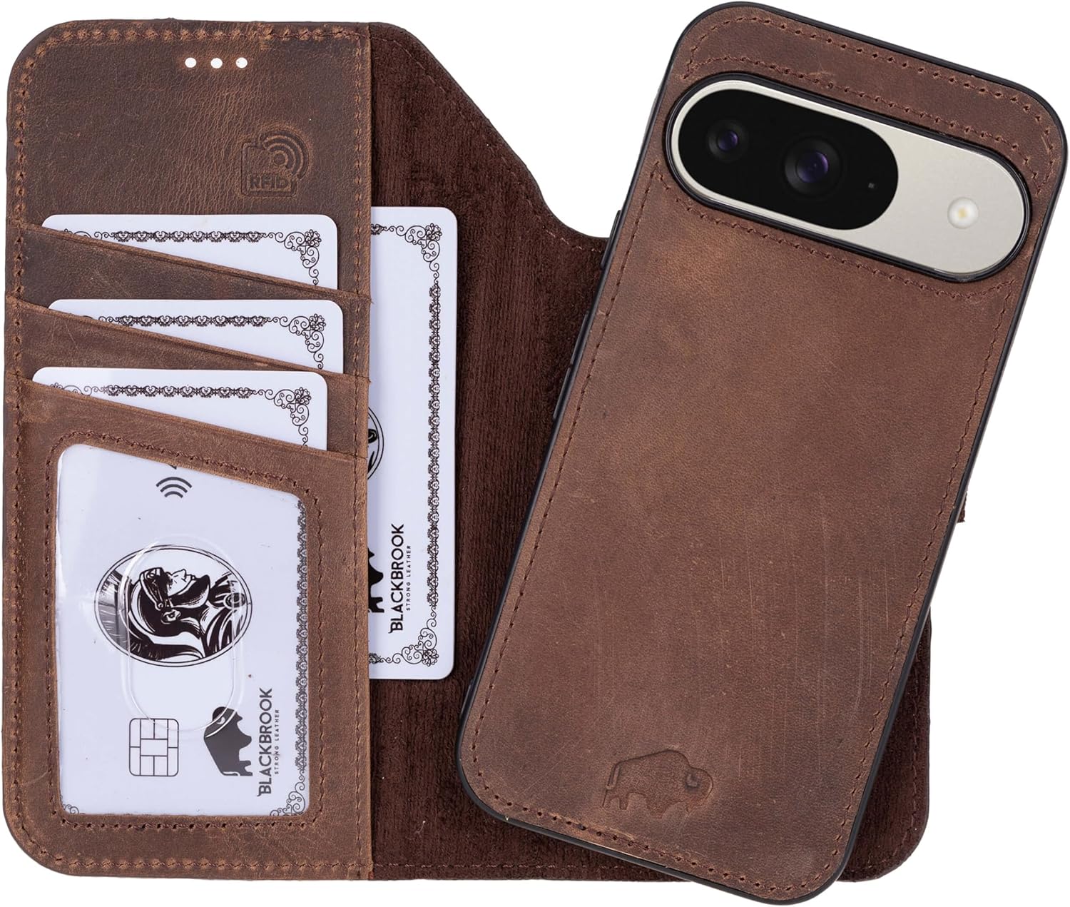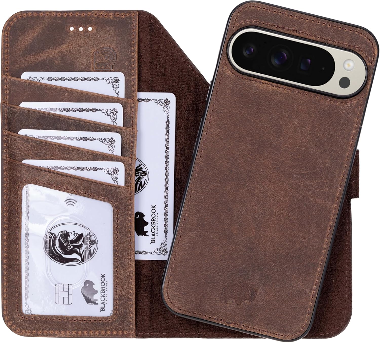 BlackBrook Carter Leather Wallet Compatible with Google Pixel 10 Pro XL – Made by Artisans, Not Machines. The Carter Wallet & Case is a stylish 2-in-1 solution designed for both organization and protection. Handcrafted from full grain burnished tan leather, it features a detachable snap-on case, a classic wallet folio, and thoughtful details that enhance daily use. 2-in-1 Detachable Design – Use as a slim snap-on case or as a full wallet folio with magnetic closure. Wallet Organization – Visible ID section plus card slots, each designed to hold one card securely. Protective Build – Shock-proof rubber edging, polycarbonate siding, and interior suede lining combine for all-around protection. Kickstand Function – Built-in kickstand provides convenient hands-free viewing. Tailored Fit – Lightweight frame secures the phone firmly while preserving full access to ports and buttons. BlackBrook Cases are handcrafted leather goods for your everyday life. Made by artisans, not machines.