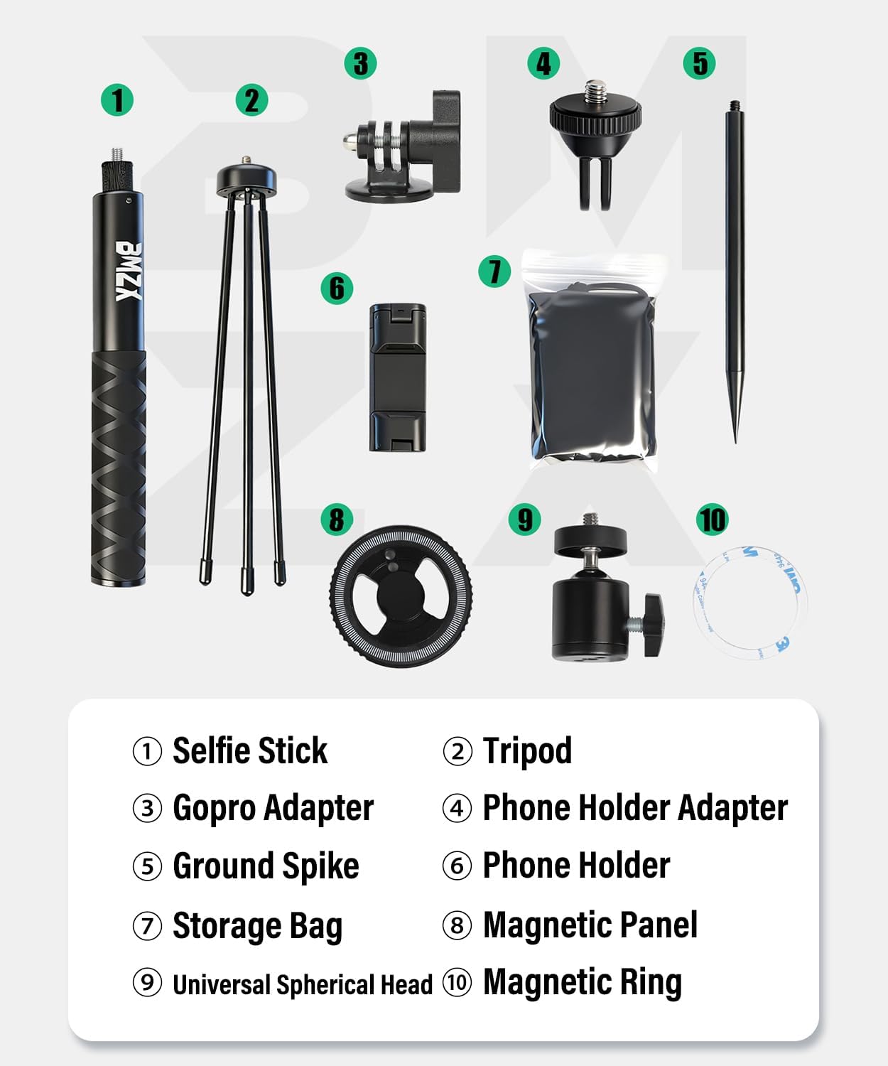 | BuiltIn Media | Gopro Adapter x 1, Phone Holder Adapter x 1, Ground Spike x 1, Phone Holder x 1, Selfie Stick x 1, Storage Bag x 1, Tripod x 1 |