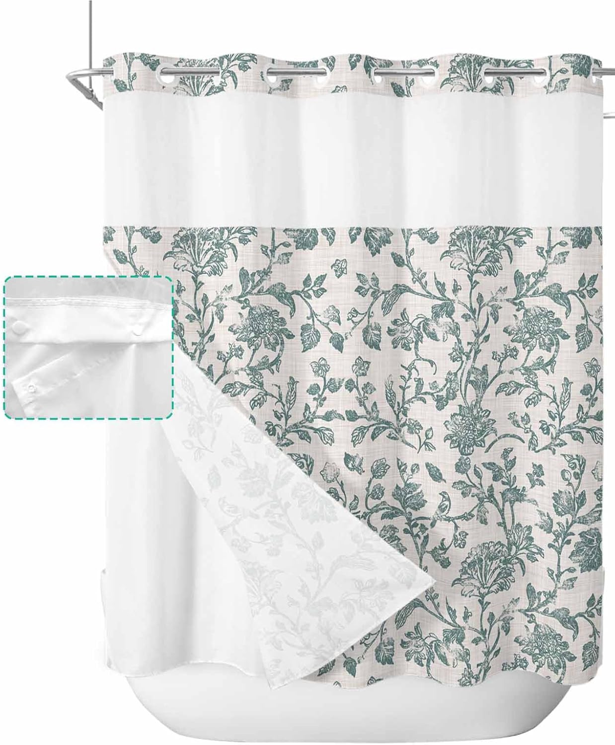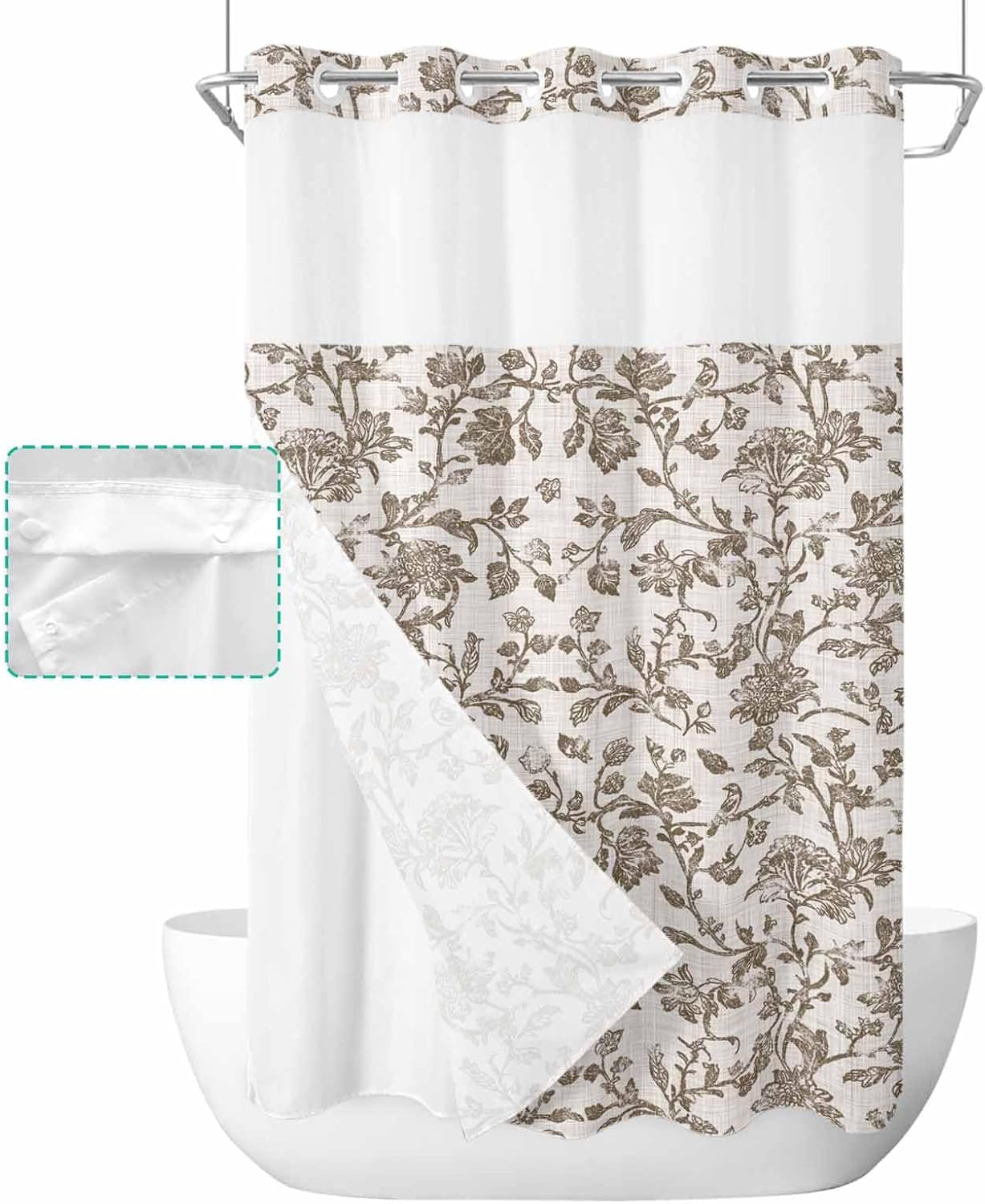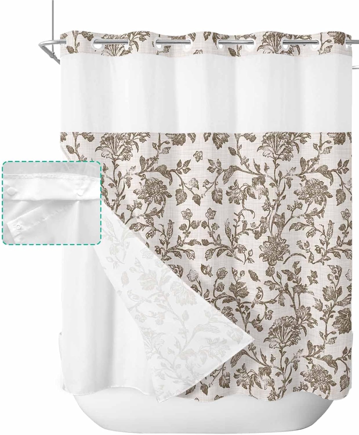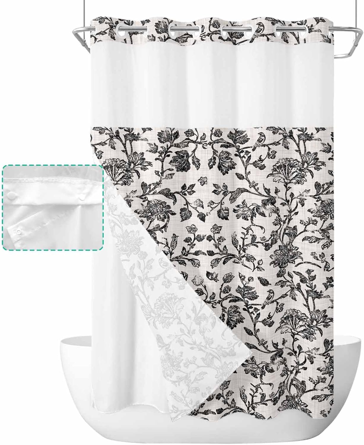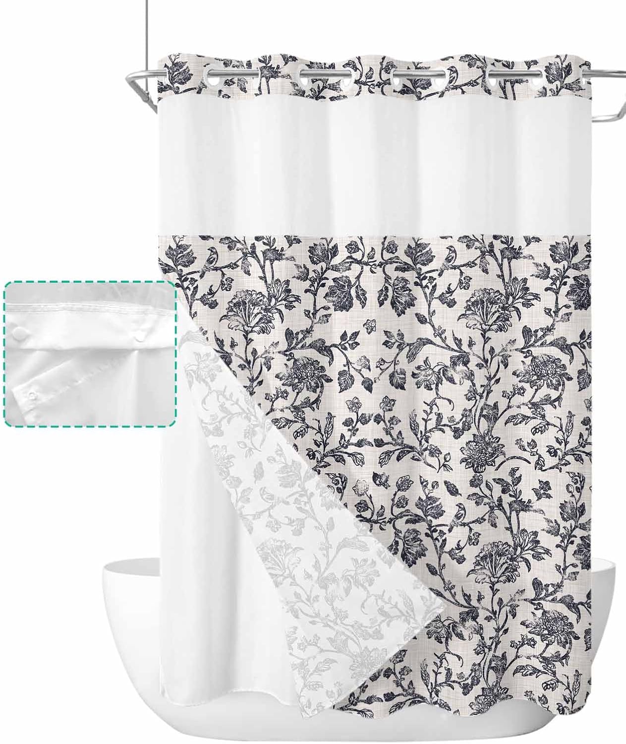Pretty No Hook Shower Curtain Well Made & Easy to Hang Printed Shower Curtain With Snap in Liner Our shower curtain adopts high-definition printed design with unique patterns and bright colors, which matches your bathroom accessories and adds some elegance to your bathroom. Premium Fabric Waterproof Fabric. Made of premium polyester blend fabric, our no hook shower curtain with snap in liner is waterproof and dries quickly, keeping the floor outside the shower dry and clean. See Through Top Window Unique top sheer design. Our shower curtain no hooks with liner with top transparent protects privacy while remaining transparent, allowing you to see outside the shower area while showering, keeping the bathroom ventilated and breathable. Double Shower Curtain Hotel shower curtains with snap on liners with replaceable liners can protect your privacy while showering and are easy to remove and replace for easy cleaning and care. Great Choice Our decorative and practical shower curtain are ideal bathroom decoration choices and are also good choices on birthday, Halloween, Thanksgiving, Christmas for your friends and family. Machine Washable Shower Curtains Machine wash in cold water, gentle cycle, tumble dry low. Suitable for busy families. Specification Material: Polyester Blend Fabric Size: 36x72 Inch/ 36x78 Inch/ 48X72 Inch/ 54x78 Inch/ 60x72 Inch/ 66x72 Inch/ 72x72 Inch/ 72x78 Inch/ 72x84 Inch/ 72x96 Inch Package: 1x Shower Curtain and 1x Inner Liner