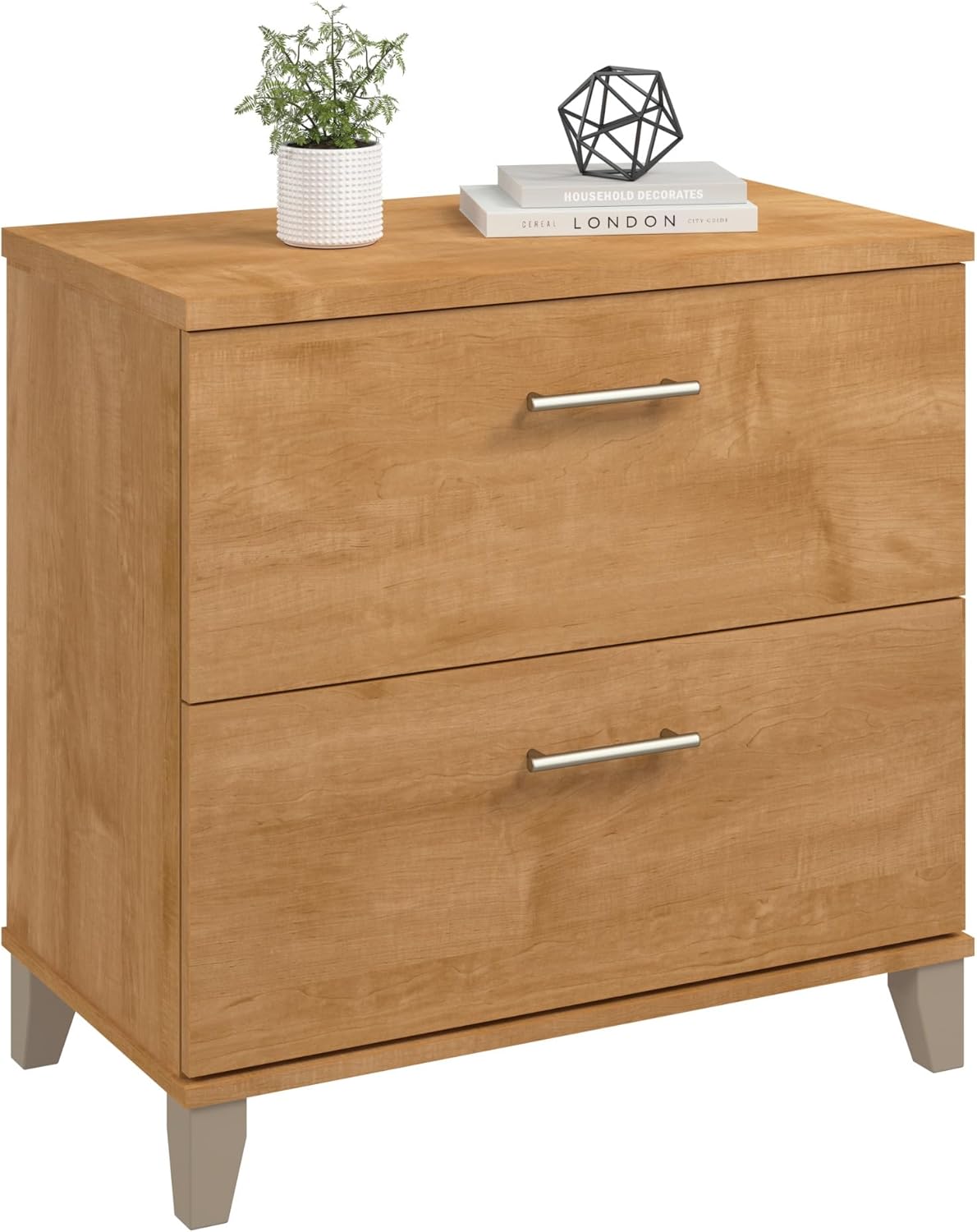 The Bush Furniture Somerset 2 Drawer Lateral File Cabinet provides an appealing home office storage solution. Two large file drawers open on smooth full-extension ball bearing slides for easy access to letter and legal-sized documents, even those all the way at the back. Drawers are designed to open one at a time for maximum stability on any surface, making this filing cabinet a safe and family-friendly addition to your home. The height of the 2 Drawer File Cabinet matches any Somerset Desk (sold separately) to allow for an extended work surface when placed side by side. Transitional styling includes your choice of attractive finishes with tapered leg accents and contemporary metal hardware for an alluring appearance to match your current home office decor. This lateral filing cabinet is tested to meet ANSI/SOHO quality standards for safety and performance and is backed by the Bush Furniture 6 Year Manufacturer's Warranty. Add the 2 Drawer Lateral File Cabinet to your existing furnishings or expand your home office with a broad range of coordinating desk and storage options from the Somerset Collection. American made with U.S. and imported parts.