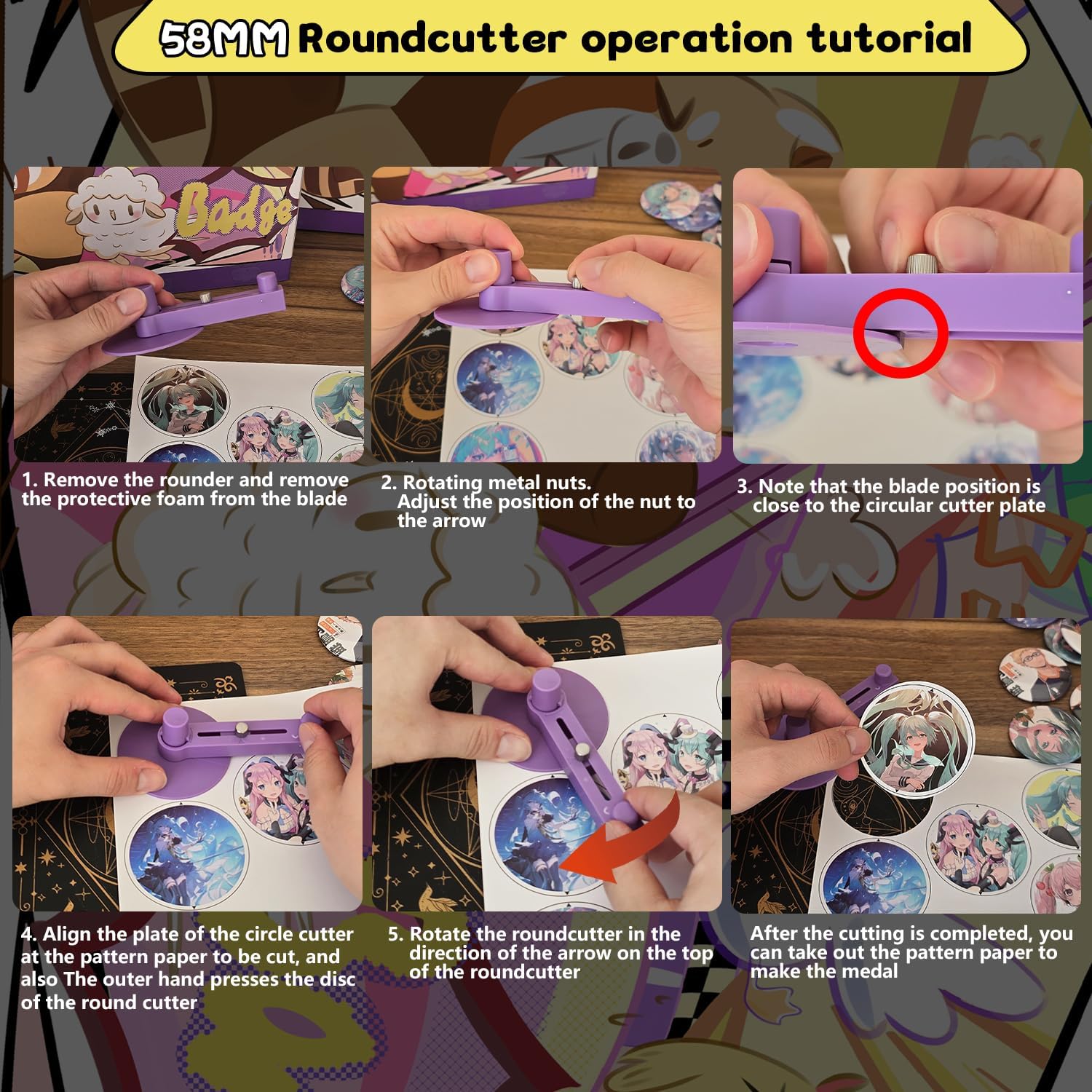 | Included Components | 58mm (2.25 inch) Badge Maker, Circle Cutters, 50pcs Button Parts, 50pcs Blank Paper, 100pcs Transparent Film, 14pcs Colored Film, 10pcs Pattern Paper, 1pcs Cutting Board, 2pcs Gasket, 5pcs Protective Case, 5pcs Transparent Bags, 5pcs Holographic Bags |