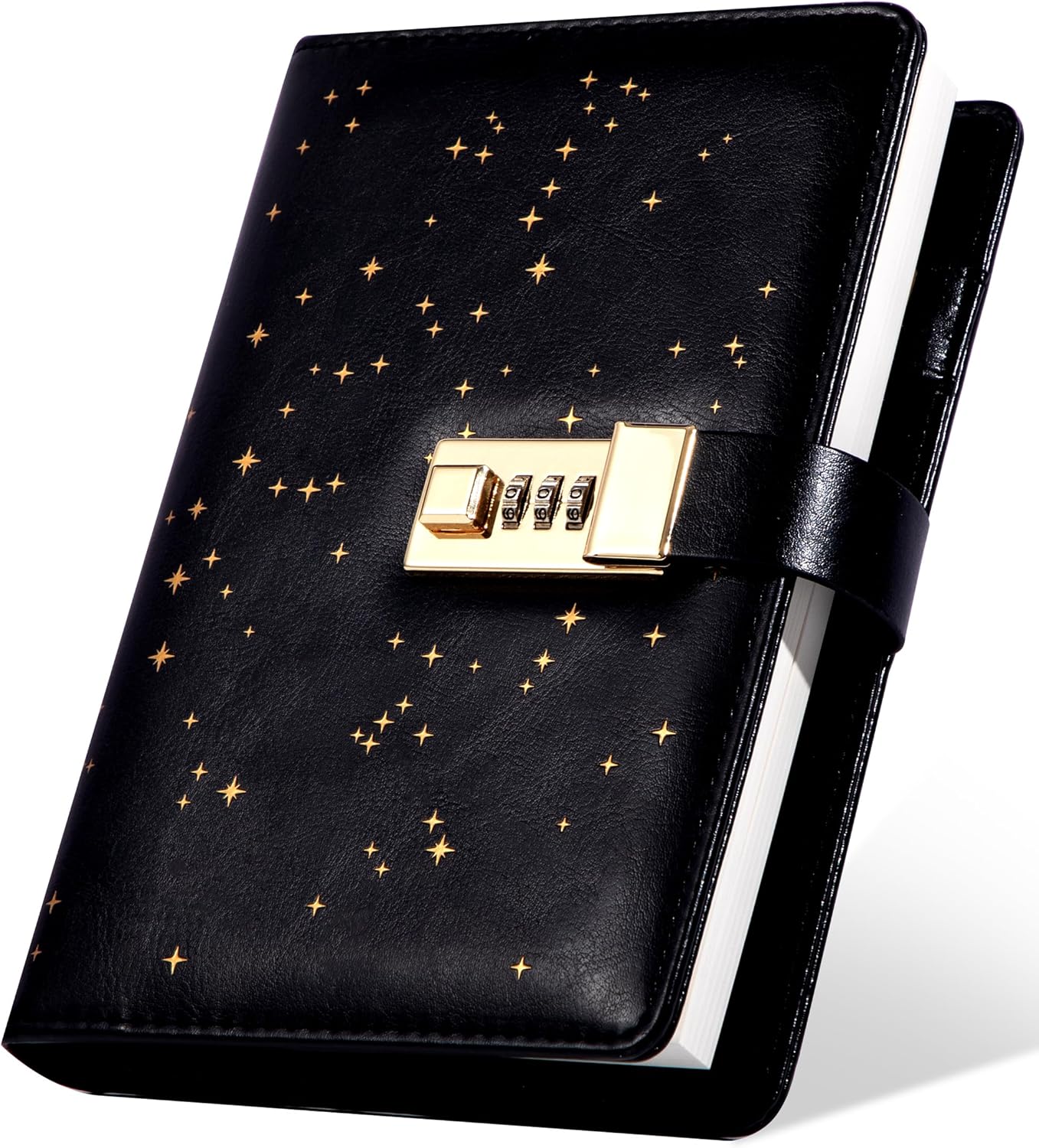 Lock Diary for Women Starry Lock Journal Refillable Personal Locking Diary Leather Locking Journal Writing Notebook Girls B6 Secret Journal with Combination Passwords 5.5 x 7.8 in, Black Shiny Star