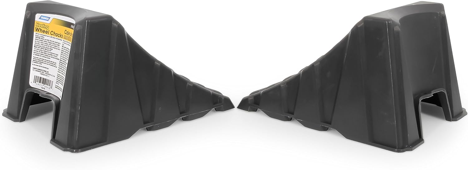 Camco's RV Nesting Wheel Chocks are designed to keep your trailer in place for safe and simple tire changing. The convenient nesting pair reduces space needed for storage. They are constructed of durable plastic with UV inhibitors and are easy to use and effective. Meets SAE J348 for tires up to 26-inches in diameter. Includes (2) wheel chocks. Color: dark gray.