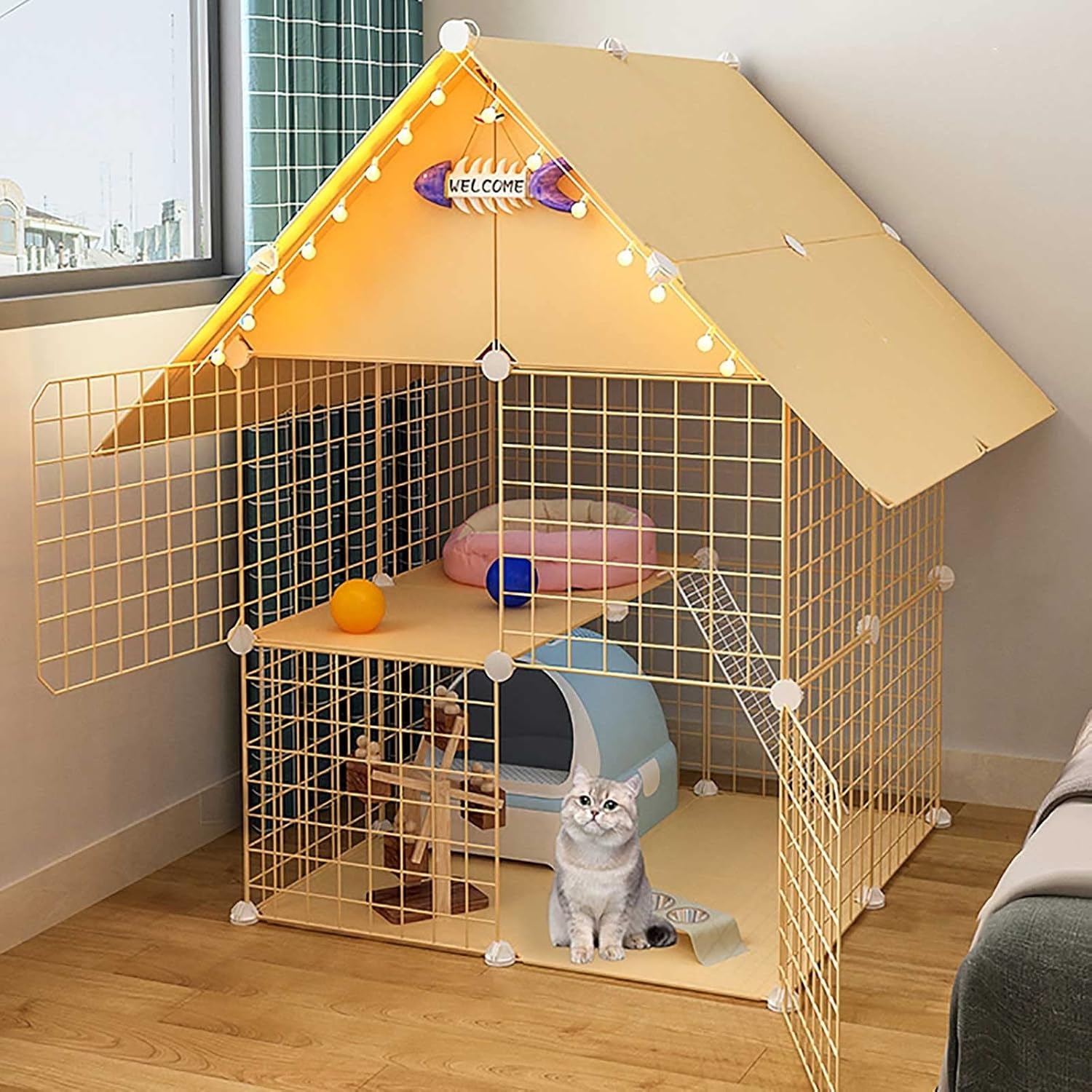 Are you looking for a cat cage that is both large and practical Our Extra Large Cat Cage is a great choice for that. The multi-door design allows your pets to enter and exit freely Each door is locked by a latch to prevent your pets from escaping Smooth seams and rounded corners protect your pets from undesired injury Ladders with small gaps ensure your pet's paws won't get stuck when climbing Specifications: Measures: 29.5"L×29.5"W×42.9"H (75x75x109cm) Color: Yellow,White,Pink,Blue Material: Metal,ABS Plastic Suitable: cats,guinea pigs and ferrets,Rabbits and other small pets PACKAGE INCLUDED: 1x cat cage 1x Cat nest 1x Cat litter box 1x Cat hammock 1x Platform climbing ladder
