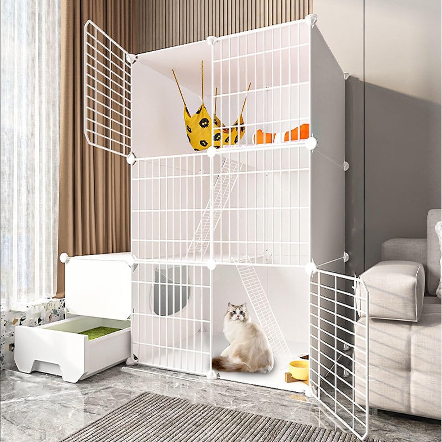 Cat cage helps reduce your cat's stress and anxiety by providing a sense of security and privacy. The large cat cage also prevents your cat from damaging your furniture or other belongings while they are in the cage. Cattery specifications Name: DIY cat cage / Pet fence / Pet playpen / Cat enclosure / Cat crate / Cat house / Cat cage villa / Cat apartment cage / Cattery Material: Iron mesh + resin + ABS plastic Size: (The size is as shown in the picture) 74*47*74CM , 109*47*74CM , 74*47*109CM , 109*47*109M , 109*47*109CM-1 , 109*47*74CM-1 , 144*47*109CM , 74*92*109CM , 109*92*74CM , 109*92*109CM , 144*92*109CM Assembly Required: Yes Package A: cat cage, drawer type cat litter box, reinforcement buckle Package B: cat cage, drawer type cat litter box, reinforcement buckle, cat nest Package C: cat cage, drawer type cat litter box, reinforcement buckle, cat nest, cat hammock Package D: cat cage, drawer cat litter box, reinforcement buckle, cat nest, cat hammock, cat bowl Note: This product includes only one cage in the picture, other accessories in the cage are not included. If you need other accessories, you need to buy the package, there are 2 kinds of packages A and B to choose from. Packing list: Package A/B/C*1