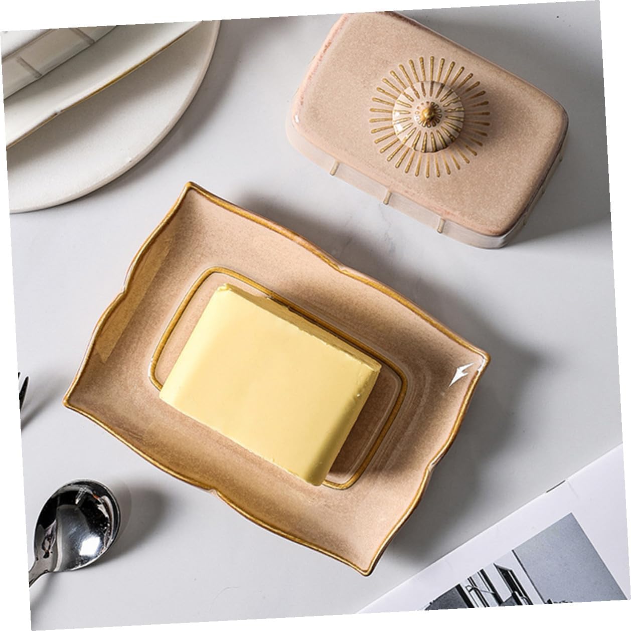 Package List 1 x Set of Butter Box with Lid Features -Product Info:Butter box -Material: Ceramic beautiful trendy butter dish. - Widely used in gatherings, parties, afternoon tea and other occasions. It can also be given as a small to friend domed butter dish. - The material is ceramic, does not fade, and can be in direct touch with food decorative butter dish. - The lid helps prevent , dust, and other dirt. The product has fine workmanship thanksgiving butter dish. - Make a great holiday for family and friends who need to stock up on butter. They will fall with the product Food Dish. - Simple and stylish design, both practical and beautiful. It can store butter, cheese, biscuits, bread and other snacks countertop butter keeper.Goods Descriptioncountertop butter keeper Are you looking for a delicate, elegant, beautiful and practical butter plate? Made of ceramic material, it's creative.Butter Service Dish This plate is very suitable for your needs, and the romantic design allows you to enjoy the and