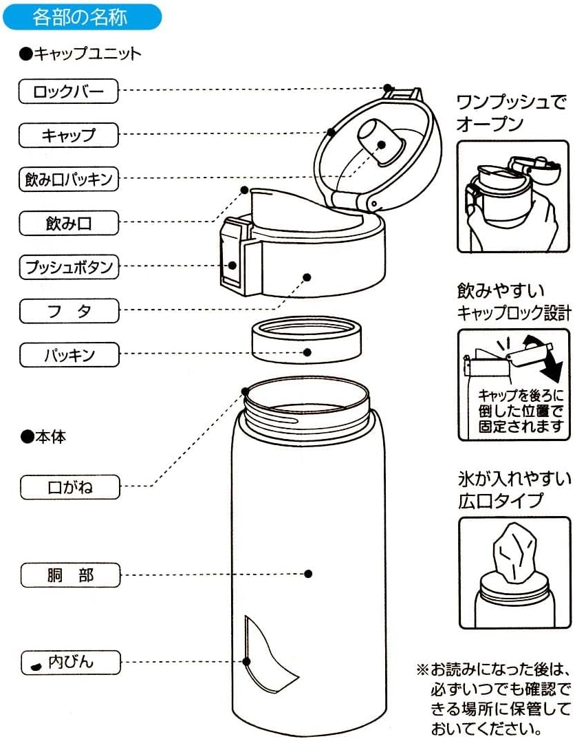 The double layer vacuum construction provides excellent heat retention and excellent cold retention. One-touch open type that allows you to drink quickly when you want to drink. Comes with a locking function for easy carrying. Open and drink directly Slim and portable 360ml capacity Soft plastic mouth Wide mouth for easy insertion of ice cubes. Cap lock design to prevent the lid from coming back when drinking.