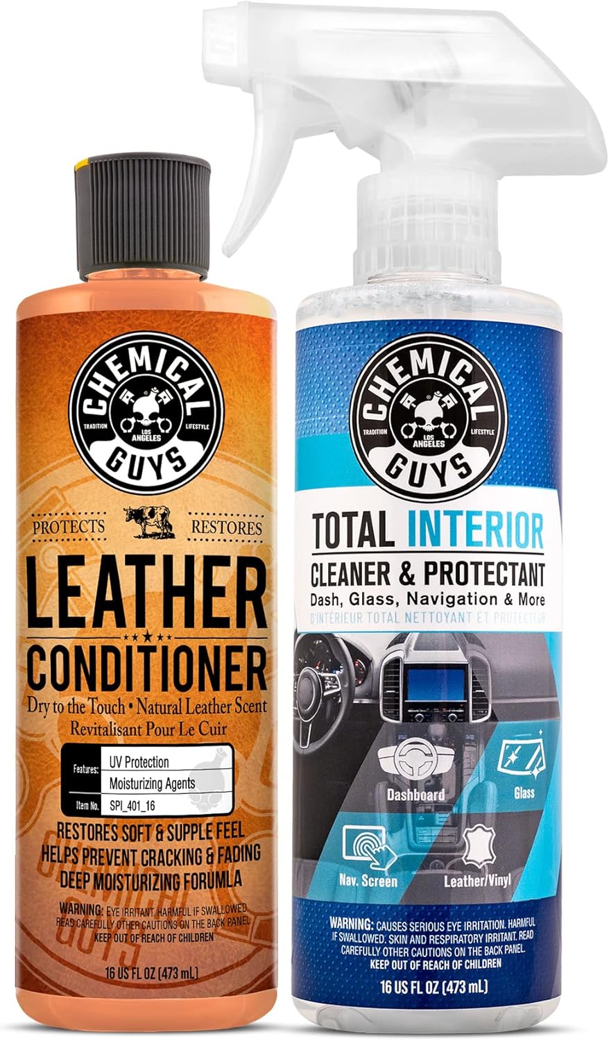 If you have leather seats, a leather coat, leather shoes or sneakers, a leather sofa or any other kind of leather product, this kit is perfect for you. More than 100 dollars worth of leather care products to keep your leather looking and smelling good are now available in this kit at a super-discounted price. Chemical Guys leather care products are widely known for being among the best for keeping your new leather looking great or conditioning your older leather so it lasts for many more years to come. Kit contains: Leather Scent Premium Air Freshener and Odor Eliminator (16 ounce), Vintage Series Leather Conditioner (16 ounce), Vintage Series Leather Serum (16 ounce), Sprayable Leather Cleaner and Conditioner (16 ounce), Extreme Colorless and Odorless Leather Cleaner (16 ounce). A must have kit for your Detailing Supplies!HOW TO USE:Use Leather Cleaner to deep clean your natural leather, durable sealed leather, synthetic leather and pleatherNext, use Leather Conditioner to moisturize your leather and restore the soft and supple feelFinally apply Leather Serum to protect your leather from sun damage that could crack, fade, and discolor your leatherUse Sprayable Leather for quick cleanupsMist a few spritzes of Leather Scent Air Freshener around the vehicle for the smell of new leatherPlease note that the color and or packaging on accessories featured in the kit may vary from what is displayed in the imageWorks safely on all automotive vehicle brands including: Acura, Audi, BMW, Buick, Cadillac, Chevrolet (Chevy), Chrysler, Dodge, Fisker, Ford, GMC, Honda, Hummer, Hyundai, Infiniti, Isuzu, Jaguar, Jeep, Kia, Land Rover, Lexus, Lincoln, Mazda, Mercedes, Mercury, Mini, Mitsubishi, Nissan, Pontiac, Porsche, RAM, Saab, Subaru, Tesla, Toyota, Volkswagen, and Volvo; and RV brands like Coachmen, Entegra, Forest River, Newmar, Thor Motor Coach, Winnebago, AirStream, K-Z, Keystone and Midwest Automotive Designs.