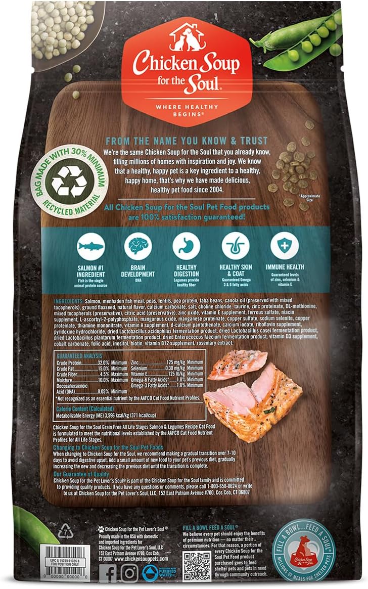 Chicken Soup Grain Free Salmon & Legumes Cat Food 12lbCat Grain Free - Salmon & Legumes Recipe Ingredients: Salmon, menhaden fish meal, peas, lentils, pea protein, faba beans, canola oil (preserved with mixed tocopherols), ground flaxseed, natural flavor, calcium carbonate, salt, choline chloride, taurine, zinc proteinate, DL-methionine, mixed tocopherols (preservative), citric acid (preservative), zinc oxide, vitamin E supplement, ferrous sulfate, niacin supplement, L-ascorbyl-2-polyphosphate, manganous oxide, manganese proteinate, copper sulfate, sodium selenite, copper proteinate, thiamine mononitrate, vitamin A supplement, d-calcium pantothenate, calcium iodate, riboflavin supplement, pyridoxine hydrochloride, dried Lactobacillus acidophilus fermentation product, dried Lactobacillus casei fermentation product, dried Lactobacillus plantarum fermentation product, dried Enterococcus faecium fermentation product, vitamin D3 supplement, cobalt carbonate, folic acid, inositol, biotin, vitamin B12 supplement, rosemary extract. Analysis: Crude Protein 32. 0% Minimum Crude Fat 15. 0% Minimum Crude Fiber 4. 5% Maximum Moisture 10. 0% Maximum DHA 0. 05% Minimum Zinc 125 mg/kg Minimum Selenium 0. 30 mg/kg Minimum Vitamin E 125 IU/kg MinimumOmega-6 Fatty Acids 1. 8% Minimum*Omega-3 Fatty Acids 1. 8% Minimum**Not recognized as an essential nutrient by the AAFCO Cat Food Nutrient Profiles. Calculated Calorie Content: Metabolizable Energy (ME)3, 596 kcal / kg 371 kcal / cup Made in the USA