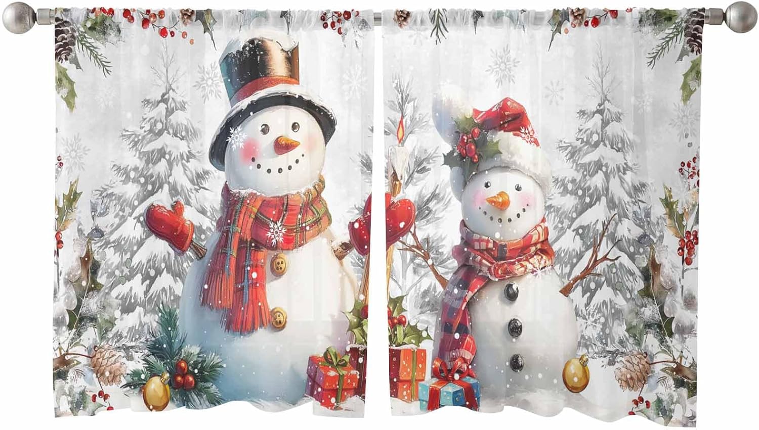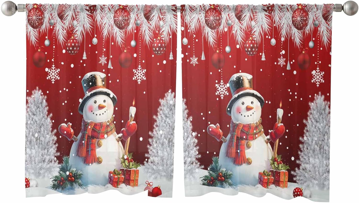 Exquisite Christmas semi sheer curtains, make you feel comfortable and relaxed in all times. Material: Quality Chiffon Package Includes: Durable semi sheer chiffon curtains with rod pocket 2 panels Rod Pocket curtains Size Chart: 52x45inx2 52x54inx2 52x63inx2 52x72inx2 52x84inx2 52x96inx2 52x108inx2 Please choose curtain panels width is 1.5-2 times wider than your window to better filter sunlight and protcet privacy. Main Function: Light soften and privacy protection Use Occasion: Window Drapes are great for home living room,bedroom,kids room,patio,villa,sliding door and more. The quality rod pocket curtains are very strong and durable,after repeated washing,window drapes are not easy to wear,tear,wrinkle or shrink. This Christmas translucent gauze curtain can decorate and beautify your home, and make your room more artistic and stylish Christmas. The beautiful patterns of Christmas snowman Holly Fruit Berry and Christmas tree give your home a more festive atmosphere and easily update the look of your home. It can also add texture and a sense of luxury, while making your room look much larger than it really is. The semi sheer window curtain panels can light filtering to create a amazing visual effects while protect your privacy.And chiffon textured window treatments curtains can bring a and airy feeling to your room,you will fall in love with it. Easy Care: Machine washable with cold water,gentle cycle.Recommended hand washing. Tumble dry and iron at low temperature if needed. Do not use bleach to keep the drapes vivid colors. Service: If you have any questions about window treatments curtains,please contact us at any time.We will answer you within 24 hours.