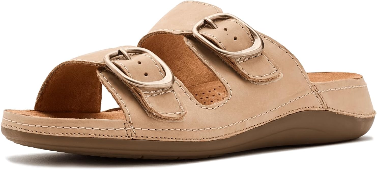 Inspired by Clarks archives, Cecily Step is an everyday sandal topped with polished buckle hardware. Premium materials lend this silhouette a timeless look and deliver dependable durability – perfect for long days on your feet. Underfoot, soft cushioning delivers complete support, while a lightweight sole absorbs the impact of every move. - Premium light ochre nubuck upper - PU foam footbed lends long-lasting support - Straps with adjustable buckles lend a secure, custom fit - Textile lining - Breathable suede sock - Grippy and flexible TPR (thermoplastic rubber) sole brings extra stability and traction - Heel height: 40mm