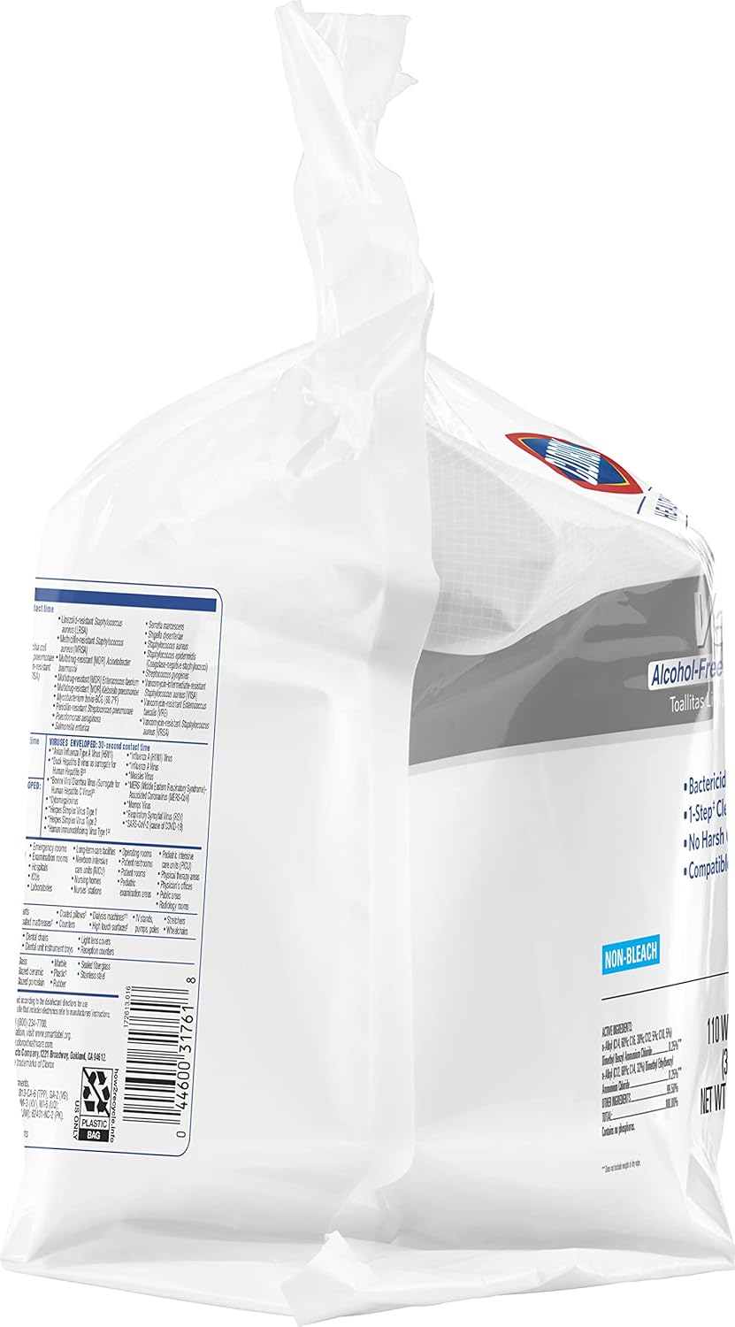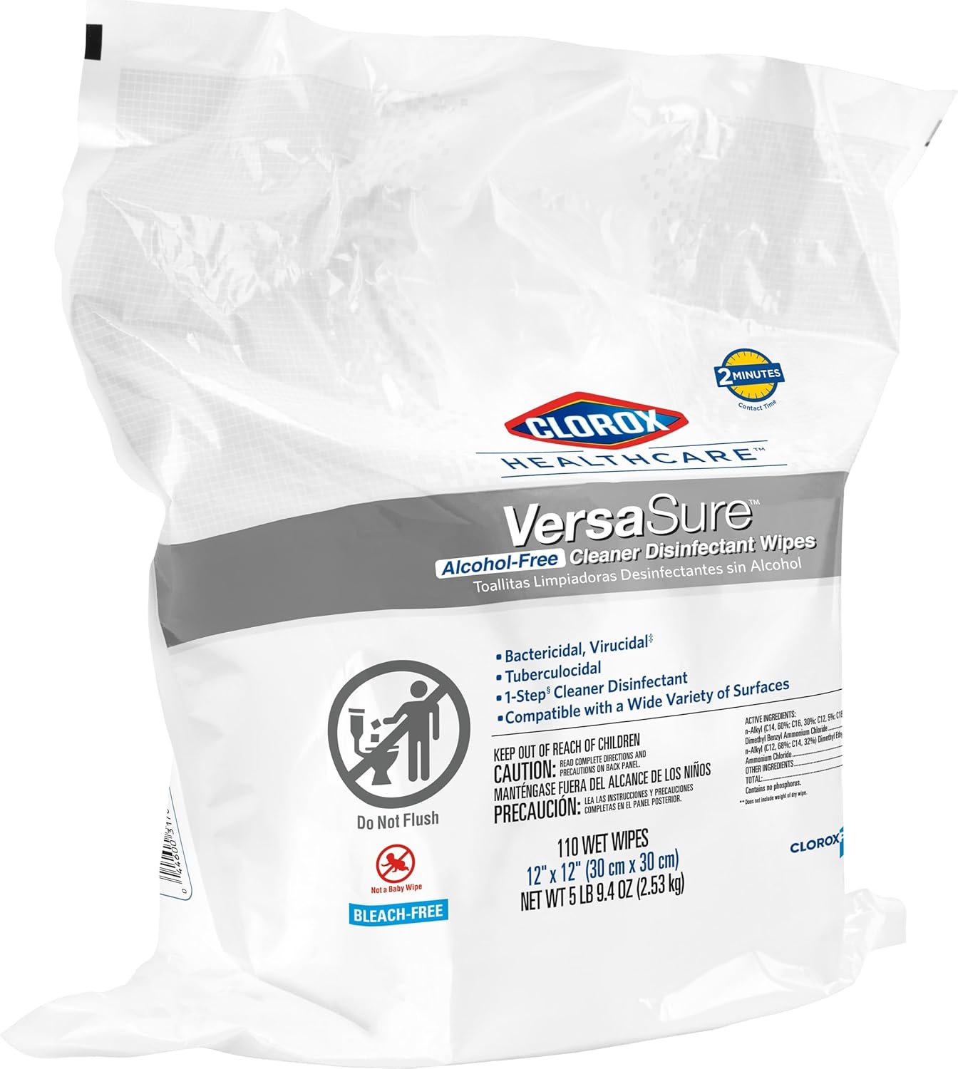 Clorox Healthcare VersaSure Cleaner Disinfectant Wipes kill over 40 pathogens* quickly on a broad range of surfaces. These strong and durable clothlike wipes are your alcohol free solution to cleaning and disinfecting. VersaSure wipes are EPA registered to kill pathogens on hard surfaces in as fast as 30 seconds for most bacteria and viruses, including mumps, measles, MRSA and tuberculosis. These one step disinfecting wipes meet EPA efficacy testing requirements for hospital disinfection, making them great for daily use in your healthcare facility. Designed for patient and staff comfort, the alcohol free quat formula is made with no harsh chemical odors, fumes or added fragrances. The non woven wipe does not leave lint on surfaces, and the larger wipe covers more surface area with less effort. This moisture lock pouch is intended for use with refillable bucket (sold separately). Intended for use in healthcare settings.