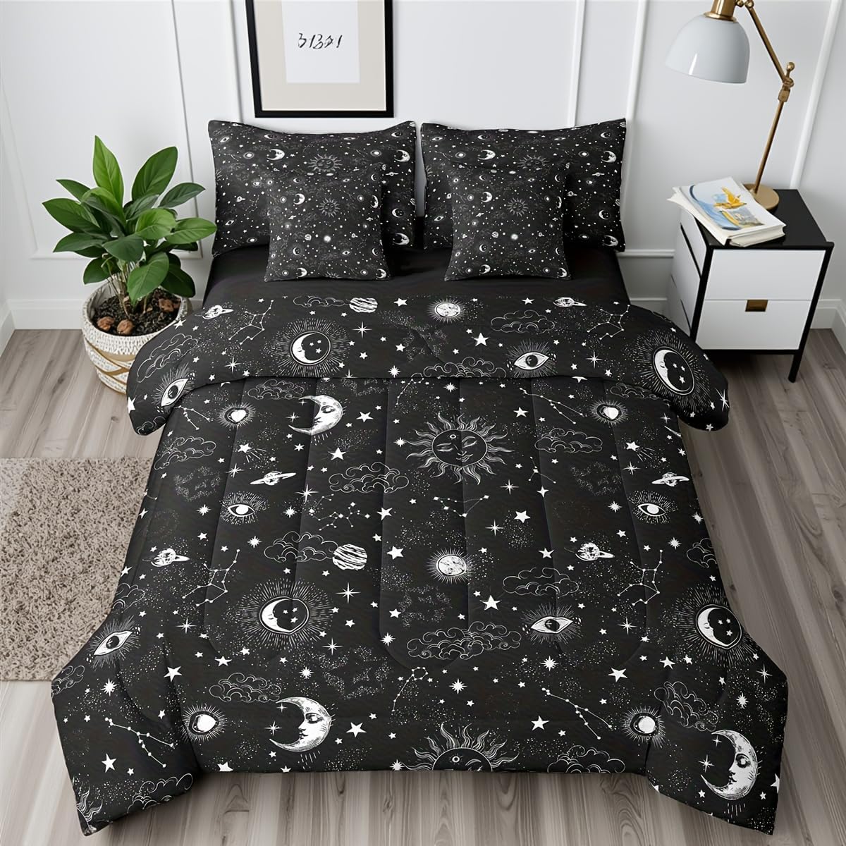 Welcome to our store. Size information: Twin size: 1 Comforter 68"W x 90"L and 1 Fitted Sheet 39"W x 75"L x 16"H and 1 Flat Sheet 67"W x 96"L and 2 Pillowcases 20" x 30" and 2 Throw Pillow Covers 18" x 18" . Full size: 1 Comforter 79"W x 90"L and 1 Fitted Sheet 55"W x 75"L x 16"H and 1 Flat Sheet 81"W x 96"L and 2 Pillowcases 20" x 30" and 2 Throw Pillow Covers 18" x 18" . Queen size: 1 Comforter 90"W x 90"L and 1 Fitted Sheet 60"W x 80"L x 16"H and 1 Flat Sheet 90"W x 102"L and 2 Pillowcases 20" x 30" and 2 Throw Pillow Covers 18" x 18" . King size: 1 Comforter 104"W x 90"L and 1 Fitted Sheet 78"W x 80"L x 16"H and 1 Flat Sheet 90"W x 106"L and 2 Pillowcases 20" x 36" and 2 Throw Pillow Covers 18" x 18" . Useful and practical: A luxurious product for homes,dorm rooms,hotels,guest rooms.Practical to use for being polyester, feels like cotton which is super soft and breathable.No chemicals used, no dye substance harming the health of you or your family. Unique design: Vivid Colors won't fade thanks to new 3d digital printing methods. These unique designs match well with various color palettes of your rugs, curtains, headboard, furniture, and all other decor accessories. Washing instructions: Machine wash it in cold water without bleach,and tumble dry on low heat to restore its freshness and appearance.