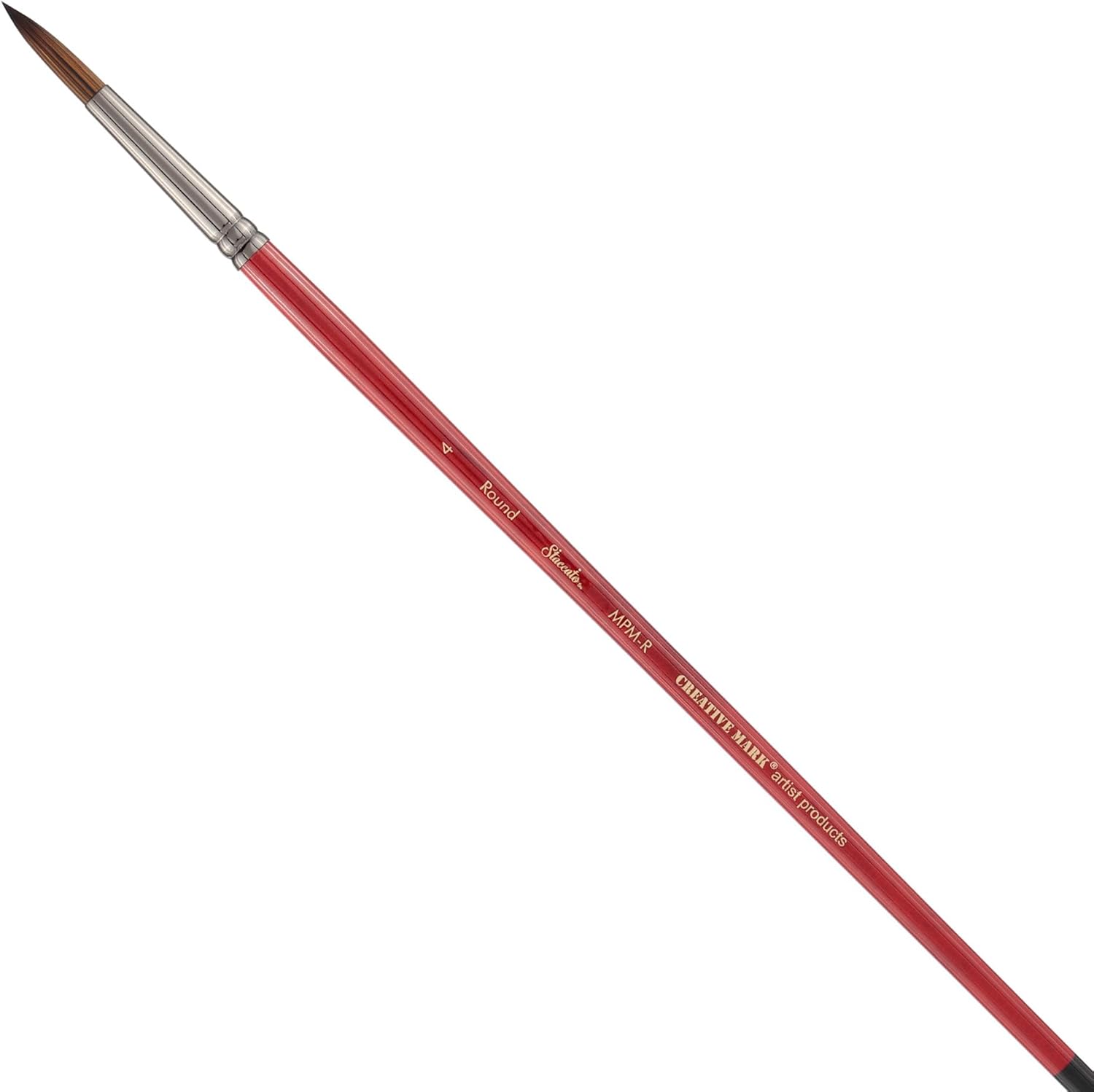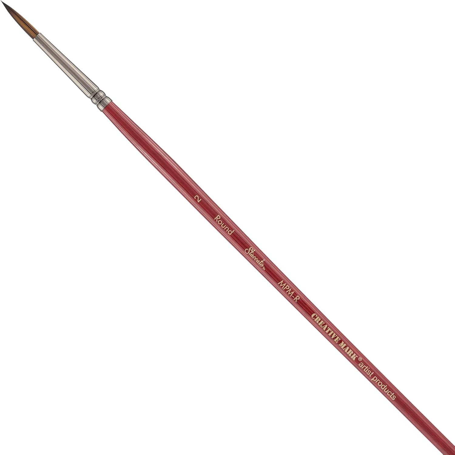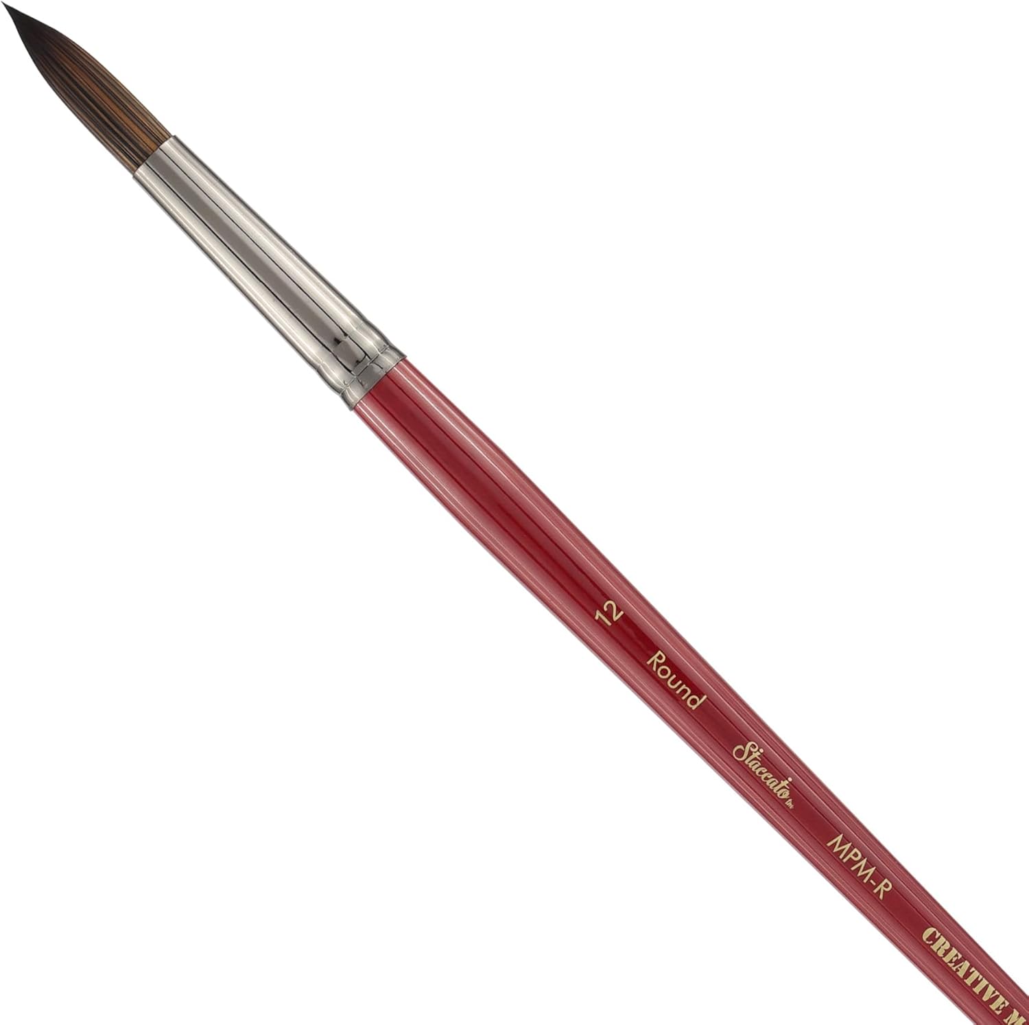 Creative Mark Staccato brushes are truly special artists' tools that are made with a proprietary blend of fine and thick synthetic hair. The thick hair creates a stiff feel, while the thin hair Allows for controlling even the thinnest of fluids. Making these brushes Perfect For everything from heavy body acrylics and stiff gels to thinned glazes and acrylic inks. Staccato provides a whole new level of performance while creating. The full bodied hair of the brush comes to a tapered edge or fine springy point. Enabling you to work either fast or slow, depending on your Application. It�s super bounce back Quality provides masterful and easy repetitive strokes. These brushes have long, lacquered cherry Wood handles, black dipped ends and seamless nickel plated brass, gun metal toned ferrules. These brushes are as beautiful as they are skilled and are sure to be one of your favorite brushes.