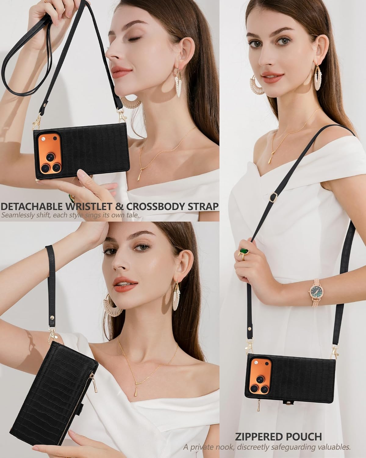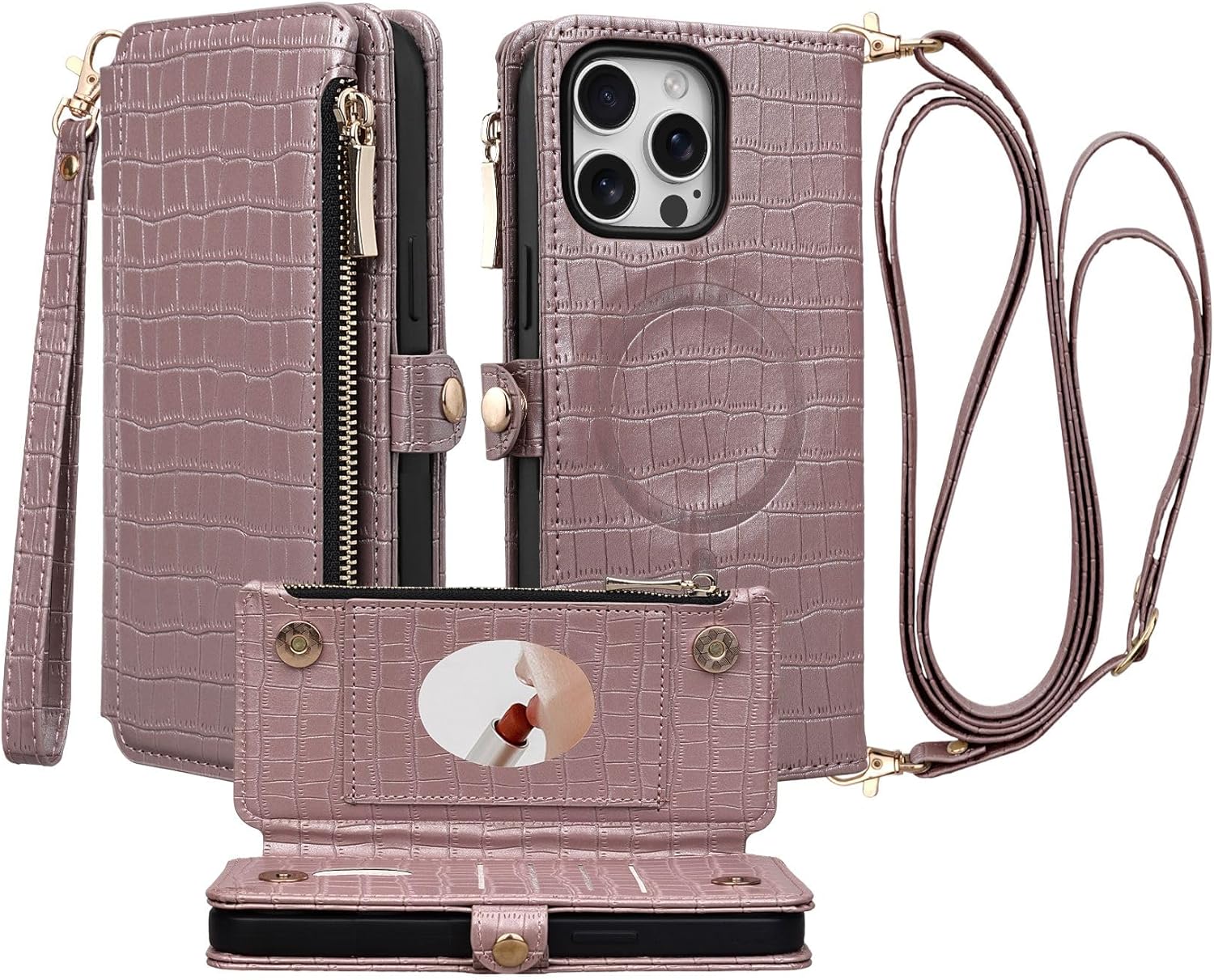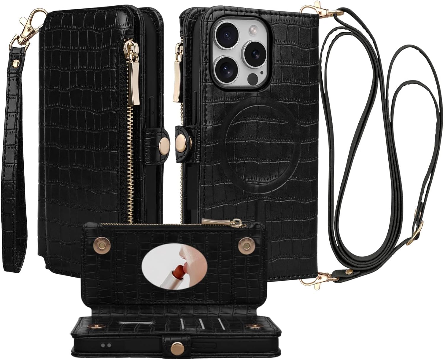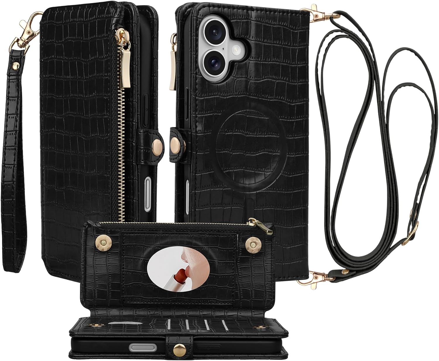 | BuiltIn Media | A Crossbody Strap, A Wristlet, Built-in Mirror, Built-in Zippered Pouch, Card Holder |