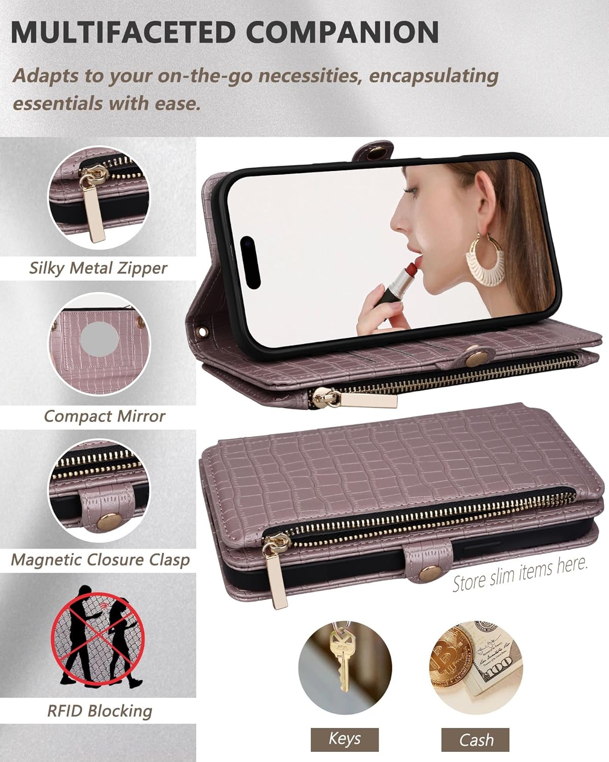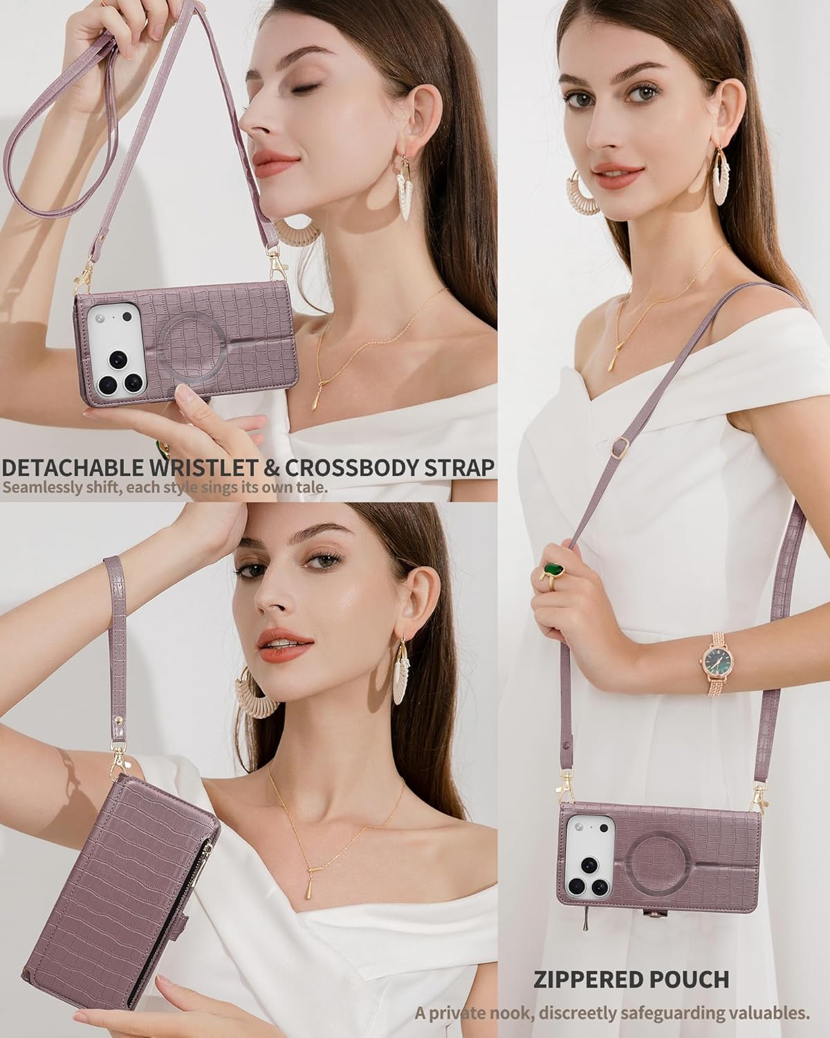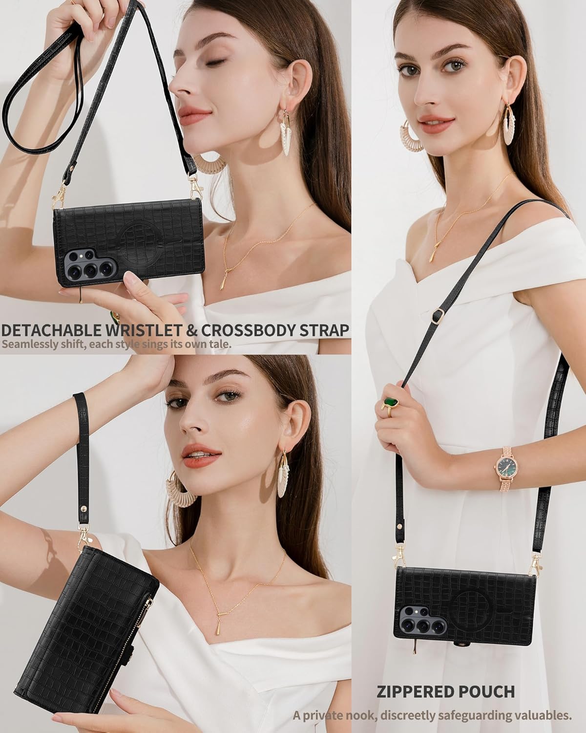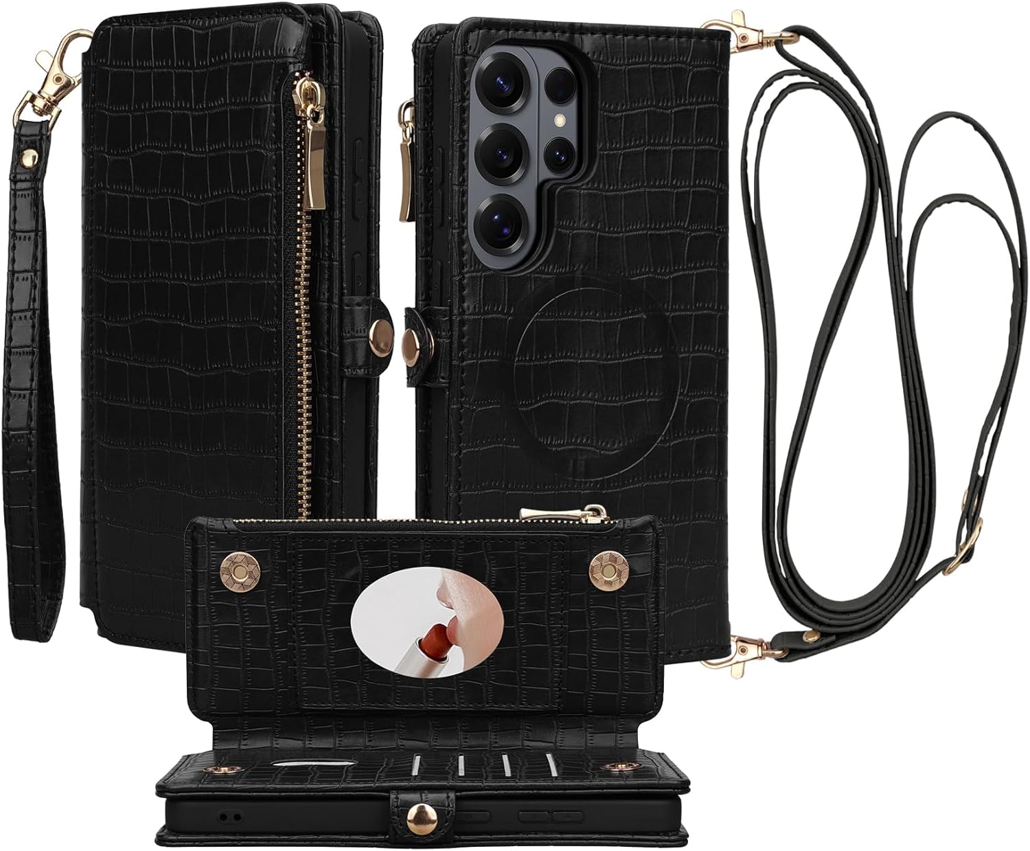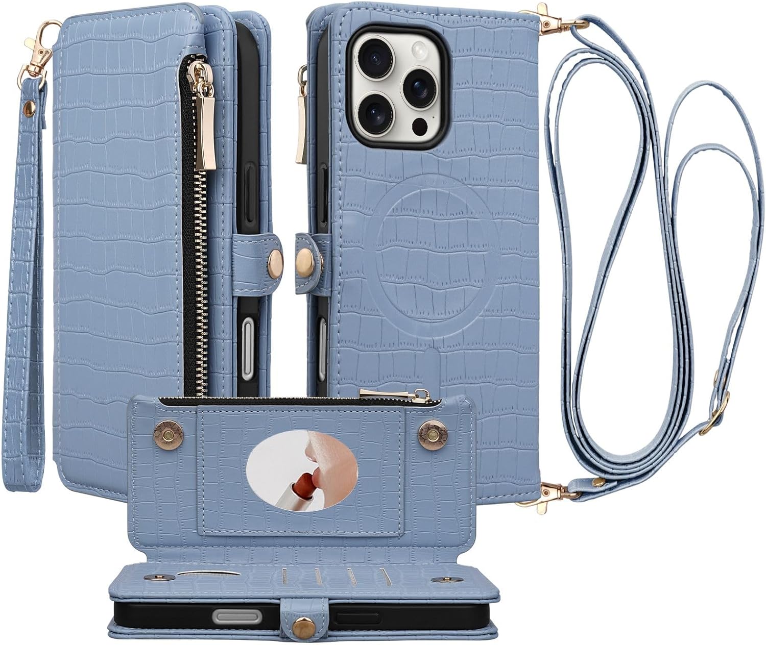 | BuiltIn Media | A Crossbody Strap, A Wristlet, Built-in Mirror, Built-in Zippered Pouch, Card Holder |
