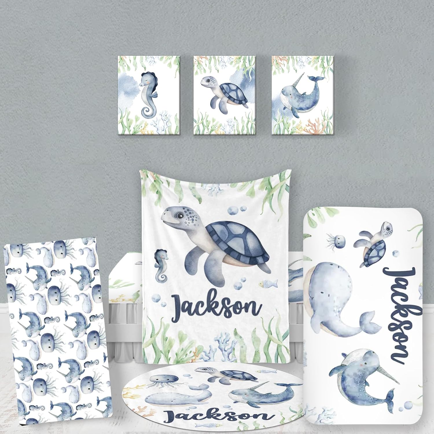 Our boy baby bedding set is designed specifically for baby boys, with cute watercolor dinosaur pattern theme that is sure to delight. Our baby bedding set includes a baby blanket, baby fitted sheet, baby pillowcase, baby room wall art, and a diaper changing pad cover, all featuring a beautiful bear forest pattern. All of our bedding pieces are made with the softest materials and are only printed in eco-friendly, water-based permanent inks, so you can feel confident knowing that you are buying a keepsake that is safe for baby and will be treasured forever. forever.5 Piece Set Including:Fitted baby sheet x1Personalized baby blanket x1Pillowcase x1Diaper changing pad cover x1Nursery Rug x1Size&Material:baby FITTED SHEET: 28"x52"x9.8"This adorable sheet is the perfect touch for your little one's nursery. Made out of ultrasoft jersey fabric, your baby will be cradled in comfort with this sheet under their head.BLANKET: 30"40" Made in ultrasoft flannel, this snuggly blanket makes a wonderful gift for any newborn baby. You can choose sharpa or flannel material and sizes:30"x40", 40"x50", 50"x60"DIAPER CHANGING COVER: 16" x32" Made out of the same buttery soft jersey as the baby sheet, this is custom printed with a matching design to really tie together your entire nursery. Features a reinforced elastic fitted lining to fit a standard changing cover.Round Baby Nursery Rug: 4 ft /40"Soft material front side and non-slip material back side. Ensure your baby enjoy crawling and good decoration in nursery.