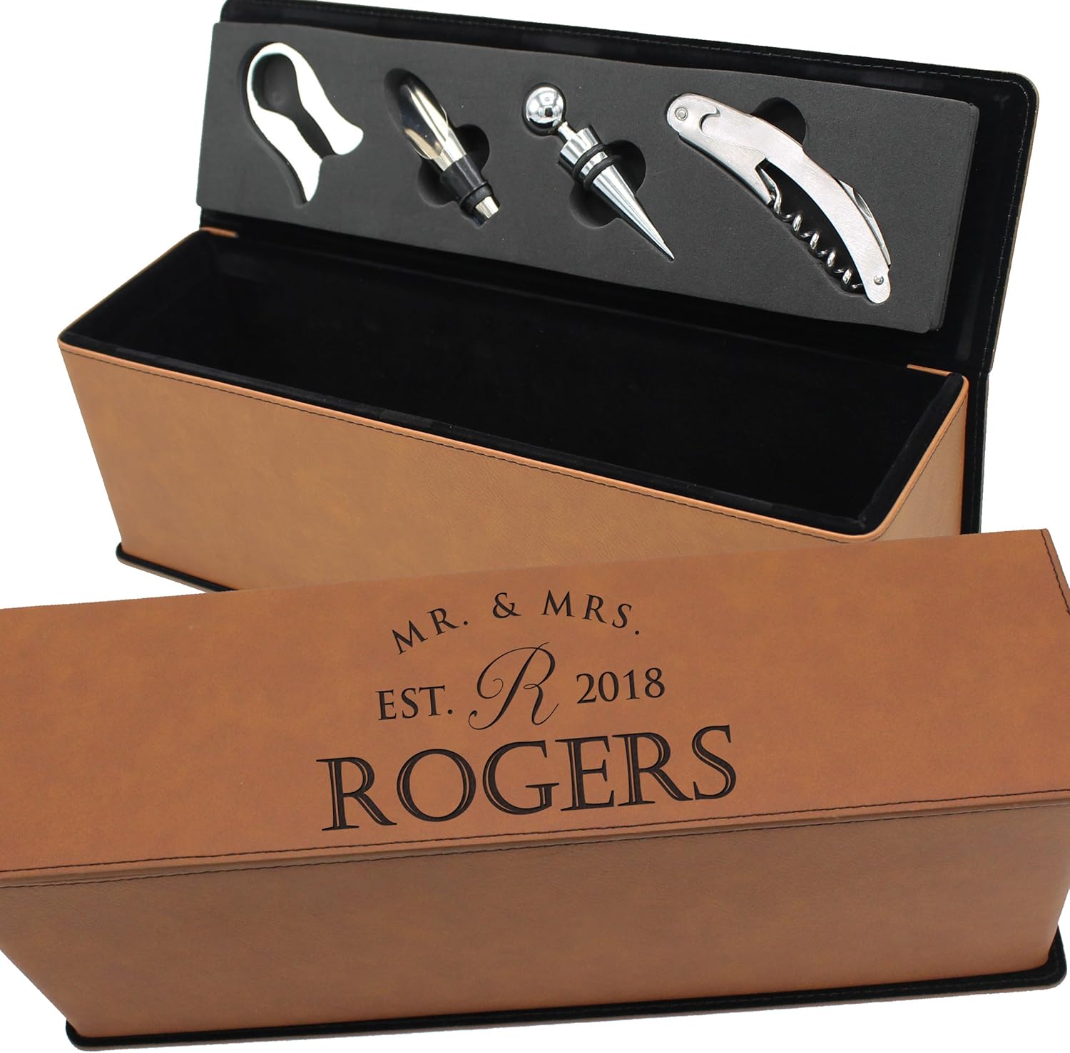 The Personalized Wine Gift Box has an elegant style and a comes with 4 great tools including foil cutter, decanting pourer, stopper and corkscrew. The box comes in 8 great colors and has a satin padded bottle holder area to safely secure your bottle . Makes a great housewarming gift, couples gift, anniversary gift, birthday gift and much more! Measures 14" x 4.5" x 4.5" and holds all regular sized wine bottles.