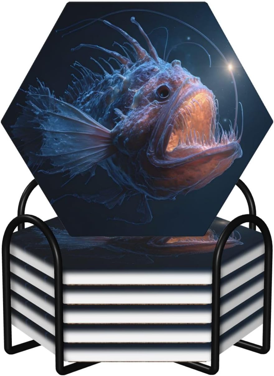 Product Name: DCEHGEW Ceramic Drink CoastersMaterial Type: Ceramic with cork bottomSize: Round: 4.1 x 4.1 inches, Square: 3.9 x 3.9 inches, Hexagon: 4.3 x 3.7 inchesPattern: Deep-sea anglerfish About Our Ceramic Absorbent Coasters:Product Features - Crafted from high-quality ceramic, these coasters are odorless and eco-friendly. Their superior absorbency keeps your surfaces dry by quickly soaking up spills from coffee, cola, and other beverages within 10-15 seconds.Applicable Scenarios - Perfect for adding a stylish touch to your kitchen, living room, bar, hotel, or restaurant. These coasters are an ideal present for birthdays, Mother's Day, Father's Day, Valentine's Day, anniversaries, housewarming celebrations, or Christmas.Accessory Structure - Each set includes 6 ceramic coasters with cork bottoms, accompanied by a sleek black metal stand for organized and aesthetic storage. Choose from three different shapes to suit your style and needs.Washing Instructions - Easily clean these coasters with water or a damp cloth.Special NoteDue to different measurement methods, a deviation of up to 0.3 cm in size is considered normal.Please Note:The product images are for reference only. Actual products may vary slightly due to production factors such as batch differences and machine settings. Minor variations in color, position, and size are normal and not considered defects. Thank you for your understanding!Customer Service:We want to make sure you have an amazing experience with us. Please contact us with any feedback you may have. We love to hear from you and usually respond within 12-24 hours.