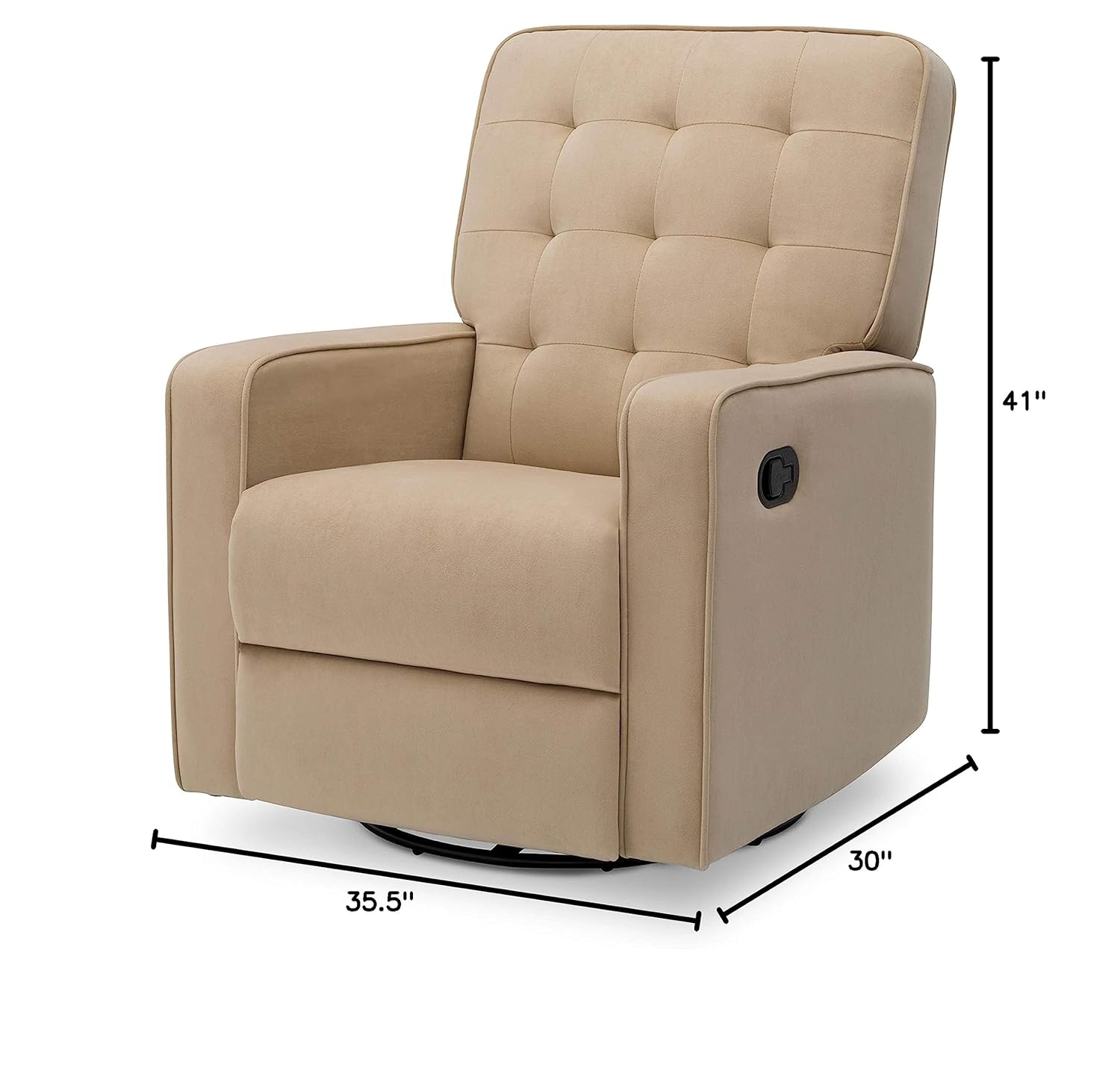 Ideal for story time or late night feedings, the Delta Children Gavin Nursery Glider Swivel Recliner featuring LiveSmart Fabric by Culp will become the ultimate hangout spot for you and your baby. The chair features plenty of ways to unwind, it has a 360-degree swivel, gliding motion, and an easy-to-reach reclining mechanism that offers two recline positions. You can keep the seat upright and just prop up your legs or fully recline for maximum relaxation. Upholstered in the most durable fabric on the market, this recliner features LiveSmart technology, which allows spills to bead up, sitting on top of the fabric until you gently blot them away. The fabric does more than prevent stains and repel moisture--it resists everyday messes to keep the chair looking as beautiful as the day you bought it. And that's not all, this versatile recliner works well in the nursery or any other living space in your home. Its sophisticated design with buttonless tufting and streamlined silhouette makes it a timeless choice. The Delta Children Gavin Nursery Glider Swivel Recliner featuring LiveSmart Fabric by Culp is available in a number of versatile neutrals that work well with everything. Delta Children was founded around the idea of making safe, high-quality children's furniture affordable for all families. They know there's nothing more important than safety when it comes to your child's space. That's why all Delta Children products are built with long-lasting materials to ensure they stand up to years of jumping and playing. Plus, they are rigorously tested to meet or exceed all industry safety standards.