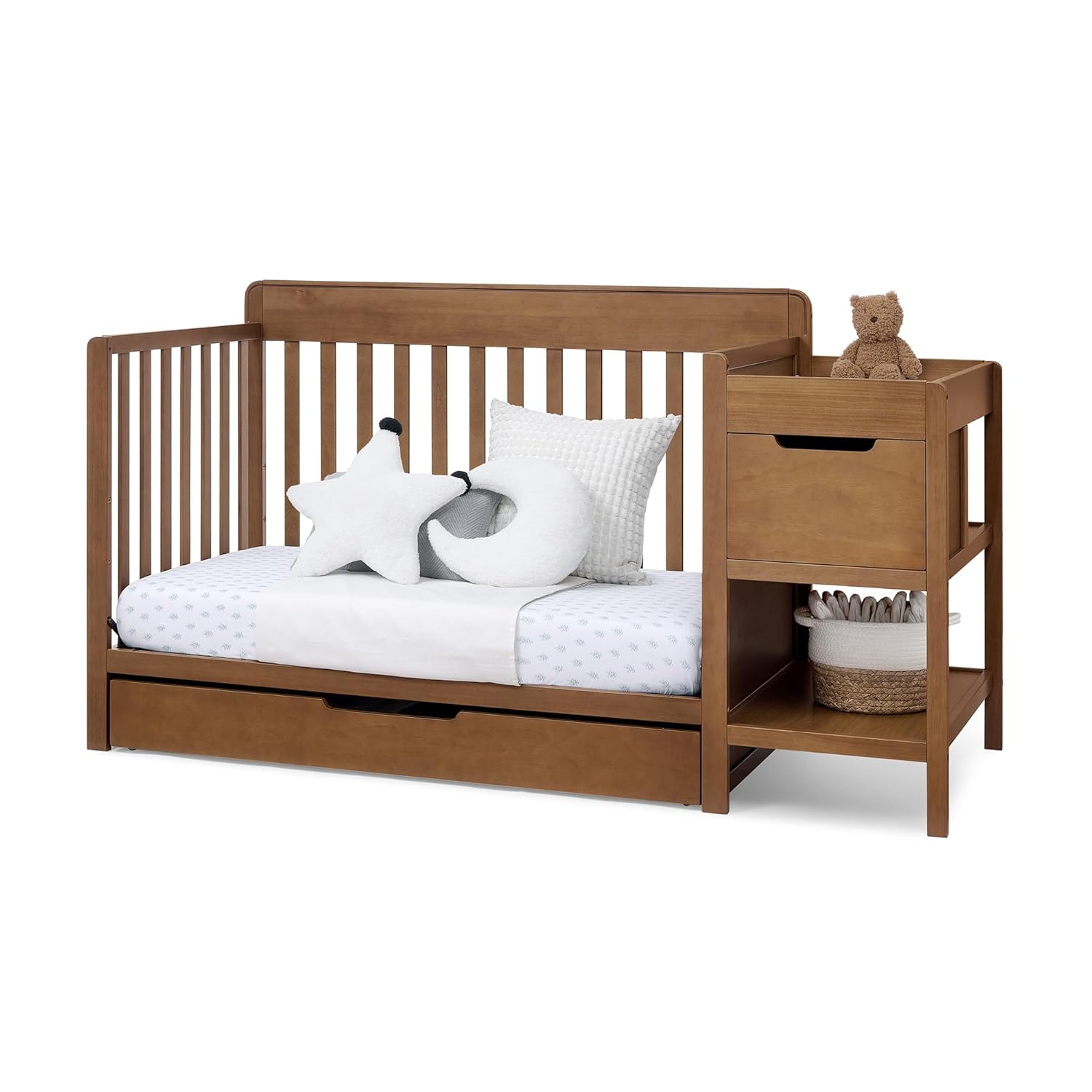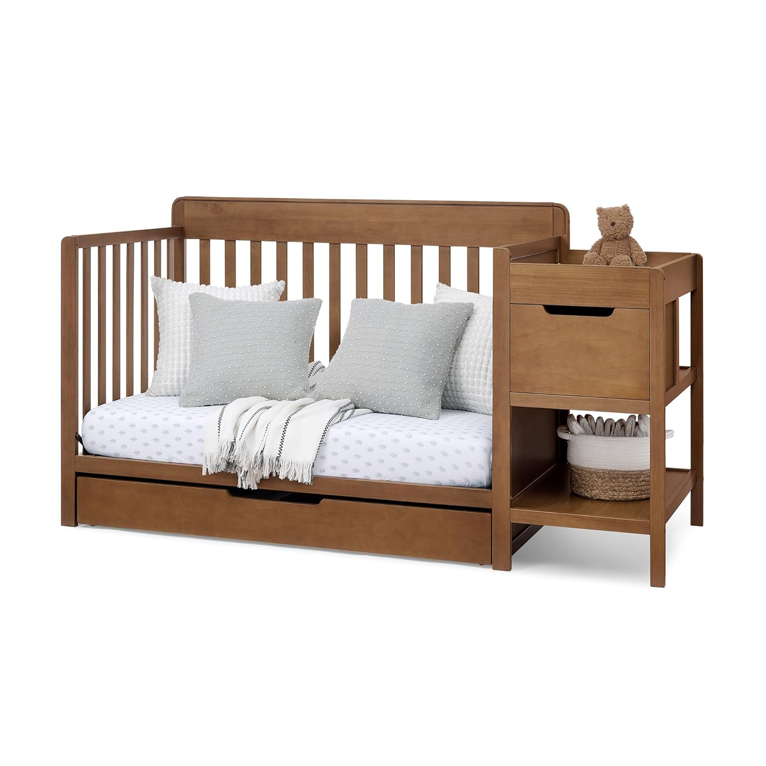 Meet the Delta Children Maya 5-in-1 Convertible Crib and Changer with Storage Drawers, a stylish and functional all-in-one nursery furniture solution designed to make life easier for parents while creating a beautiful space for baby. Combining a convertible baby crib, attached changing table, and built-in storage, this thoughtfully designed piece maximizes space and convenience, making it ideal for modern nurseries and smaller rooms.The Maya features a crib with changing table and drawers, allowing parents to keep everything they need for diaper changes and daily routines within reach. A spacious under-crib storage drawer provides room for blankets, sheets, and baby essentials, while the attached changing station includes an additional drawer, an open storage shelf, and a water-resistant changing pad for quick and easy cleanups. This smart design helps keep the nursery organized while reducing the need for extra furniture.Designed with a clean silhouette and modern cut-out handles, the Maya brings contemporary style to your nursery while maintaining the timeless look parents love. The classic slat crib design pairs easily with a variety of nursery décor styles, making it a versatile centerpiece for your baby’s room.This 5-in-1 convertible crib is built to grow with your child, transitioning from a baby crib to toddler bed, daybed, sofa, and full-size bed with headboard to support your child from infancy through the teen years. The mattress support base features three adjustable mattress height positions, allowing you to lower the mattress as your baby begins to sit, pull up, and stand for added safety and convenience. (Mattress, Daybed/Toddler Rail Kit, and full-size metal bed frame sold separately.)Crafted by Delta Children, America’s trusted baby furniture brand, the Maya crib is designed with safety, durability, and everyday practicality in mind. The sturdy construction and multi-functional design make it an excellent option for parents looking for a crib with storage and changing table that saves space while offering long-term value.Perfect for parents building a nursery from scratch or upgrading their baby’s room, the Delta Children Maya 5-in-1 Convertible Crib and Changer with Storage Drawers delivers the ideal combination of style, organization, and versatility, making it a smart choice for families who want nursery furniture that grows alongside their child.