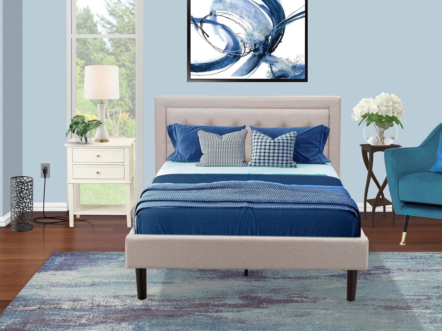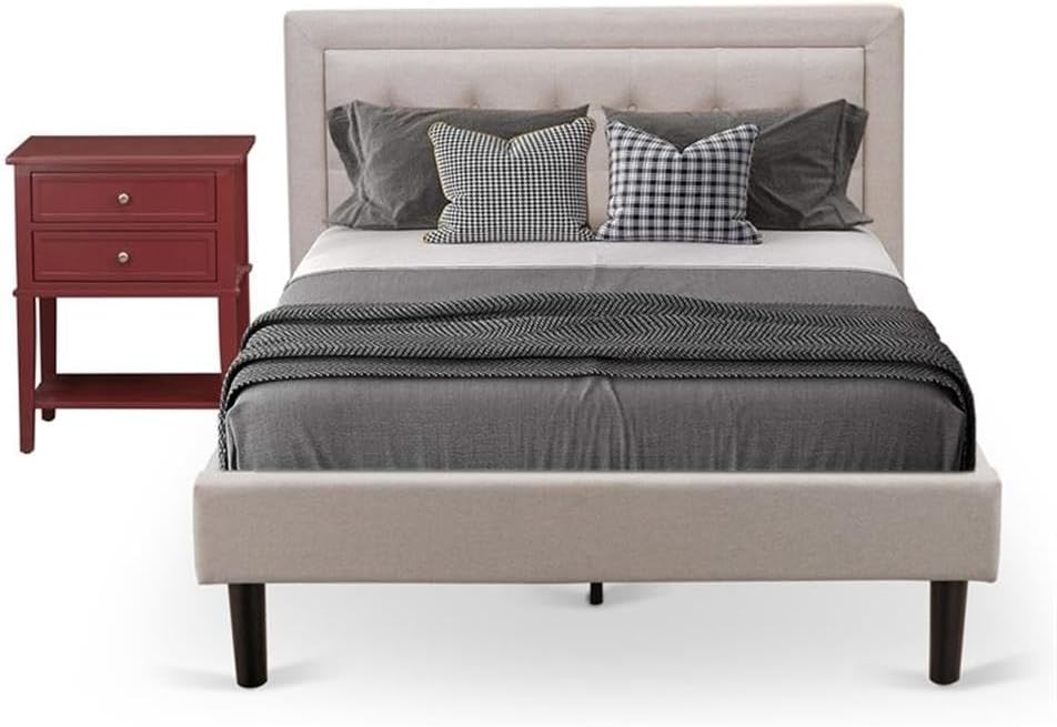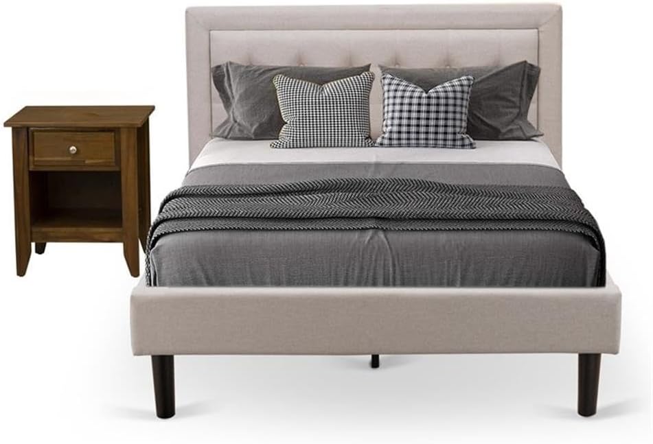EAST WEST FURNITURE - FN08F-1HAE0 - 2-PC PLATFORM BEDROOM FURNITURE SETTransform your bedroom into an exquisite sanctuary with this extraordinary upholstered full size bed set. Get ready to give your personal space a modern and elegant touch with our all-inclusive 2-piece furniture set for your master bedroom. The set consists of a sleek platform bed frame with a headboard and a contemporary nightstand in Linen White. Meticulously crafted, the Fannin bed frame, upholstered in Mist Beige linen fabric, adds a luxurious charm to any bedroom. Our exceptional full size bed set is designed to provide maximum comfort, ensuring a delightful lounging experience. The plywood slats offer excellent support, while the sturdy equidistant slats enhance durability, ensuring a long-lasting lifespan. Assembly is a breeze as we have thoughtfully included everything you need, eliminating the need for extra tools. Simply gather your loved ones, and in no time, you'll enjoy the pleasure of assembling this modern bed and revel in the satisfaction of its creative design.FULL BEDROOM SET FEATURESMaterial: Engineer WoodFull Bed Fabric Color: Mist BeigeWood Bed Frame Legs Color: BlackNight Stand for Bedrooms Color: Linen WhiteDimensions of Upholstered Bed: Length: 84; Width: 59; Height: 41.30.End Table for bedroom dimensions are: Length: 21; Width: 18; Height: 24.Package Includes 1 Platform Bed and 1 Mid Century Modern Nightstand.Note: Fannin Wood Bed Frame, Headboard, Footboard, and Solid wood slats are offered. The mattress will not be included in this Full Size Bedroom Set.