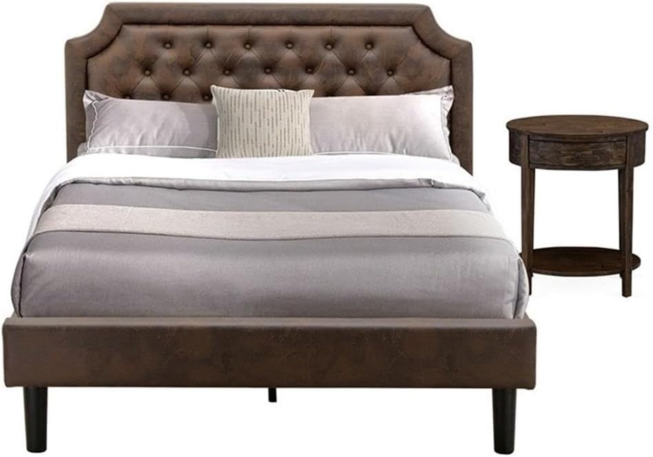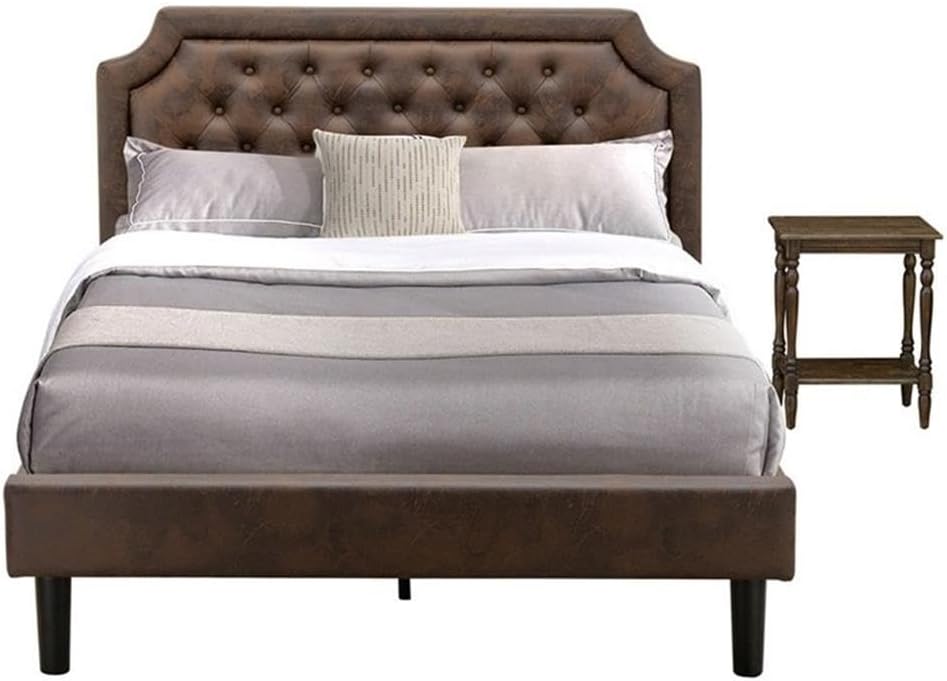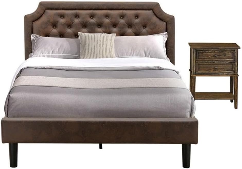 EAST WEST FURNITURE - GB25Q-1GA07 - 2-PC PLATFORM BEDROOM FURNITURE SETExperience the epitome of luxury and relaxation with our stunning modern bed, featuring gorgeous faux leather cushioned padding. This 2-piece queen bedroom set includes a queen size frame with a headboard, as well as an attractive bedroom nightstand. Our modern bed effortlessly adds a touch of opulence to classic bedrooms while offering a unique twist to any modern setting. The accompanying small end table exudes traditional charm, enhancing the overall aesthetic of the set. Crafted with sturdy solid wood slats, our bed set ensures exceptional support and minimal mattress sagging, catering to both inner-spring and foam mattresses. Cleaning is a breeze, thanks to the smooth finish that can be easily maintained with a damp cloth. Additionally, assembling this platform bed frame is a straightforward process, aided by the step-by-step assembly instructions and comprehensive components pack provided. Indulge in the perfect blend of style, comfort, and durability with our queen bed set furniture. Create a lavish and relaxed atmosphere in any room while enjoying the superior support and classic design of our modern bed and small end table.BED SET FEATURESMaterial: Engineered WoodWood Bed faux leather headboard color: Dark BrownQueen Wood Bed Frame Legs Color: BlackSmall Nightstand Color: Distressed JacobeanDimensions of queen size bed frame: Length: 89; Width: 65; Height: 47.Small Nightstand Dimensions: Length: 21; Width: 18; Height: 24.Package Includes 1 Queen Size Frame and 1 End Table.Note: Wood Queen Bed Frame, Headboard, and hardwood slats are provided. The mattress will not be included in this Wooden Set for Bedroom.