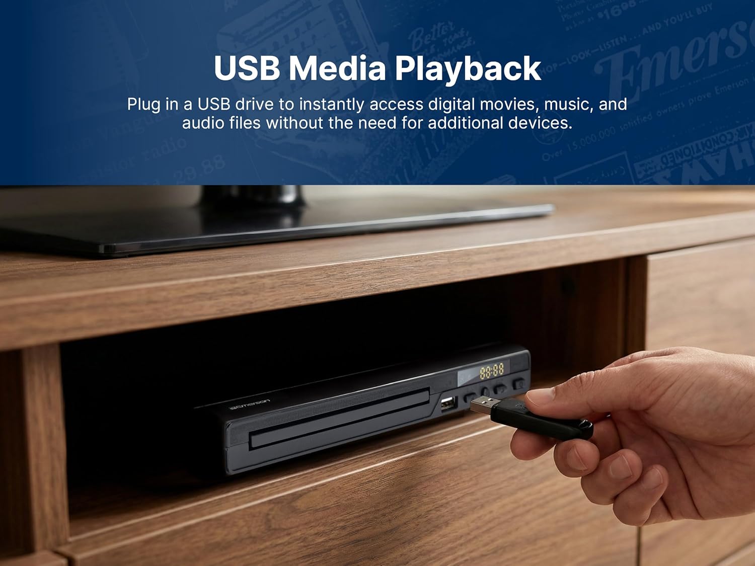 Unlock your entire media collection with the Emerson ED-8001 Multi-Format DVD Player, your new, versatile hub for home entertainment. Engineered for global compatibility and sleek, space-saving design, this compact player is the perfect all-in-one solution for movie nights, music listening, and digital playback in any room. Bring your favorite films, music, and digital files to life. The ED-8001 seamlessly plays a wide range of disc formats and media files, offering unparalleled versatility. Watch your DVD movies in vibrant detail, listen to audio CDs with crisp sound, or enjoy your personal MP3 collections directly from discs or a USB flash drive. The added CD Ripping function allows you to easily convert your audio CDs to digital MP3 files for playback on other devices, making it simple to preserve and transfer your music library. Designed for ultimate convenience and user-friendly operation, the player features a clear front LED display for easy track and time navigation. The included full-function remote puts complete control at your fingertips, letting you play, pause, skip, and manage your media from the comfort of your couch. Its compact, low-profile design fits effortlessly into any entertainment setup, from a living room media console to a bedroom or home office, without sacrificing performance. Whether you're upgrading an older player, building a secondary entertainment station, or looking for a straightforward, reliable way to access your physical and digital media, the Emerson ED-8001 delivers. It combines essential modern features with straightforward operation in a stylish, compact chassis.